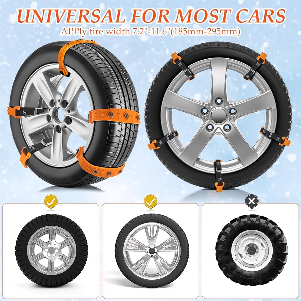 • Universal Fit: our winter tire chains for cars are universally designed to accommodate varying car model tire sizes, specifically between 7.3'' - 11.7'' (185mm-295mm); Regardless of your car model, we've got you covered, ensuring a tight