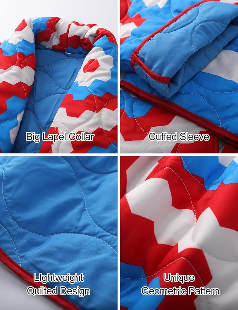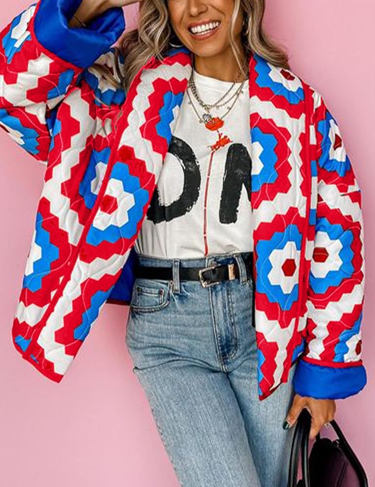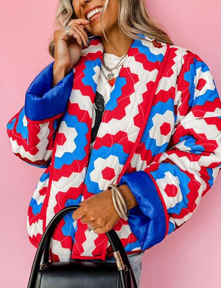سترة Flygo المبطنة بالزهور للنساء سترات منتفخة قصيرة خفيفة الوزن كبيرة الحجم مفتوحة من الأمام مطبوعة أسفل معطف (أحمر-L)