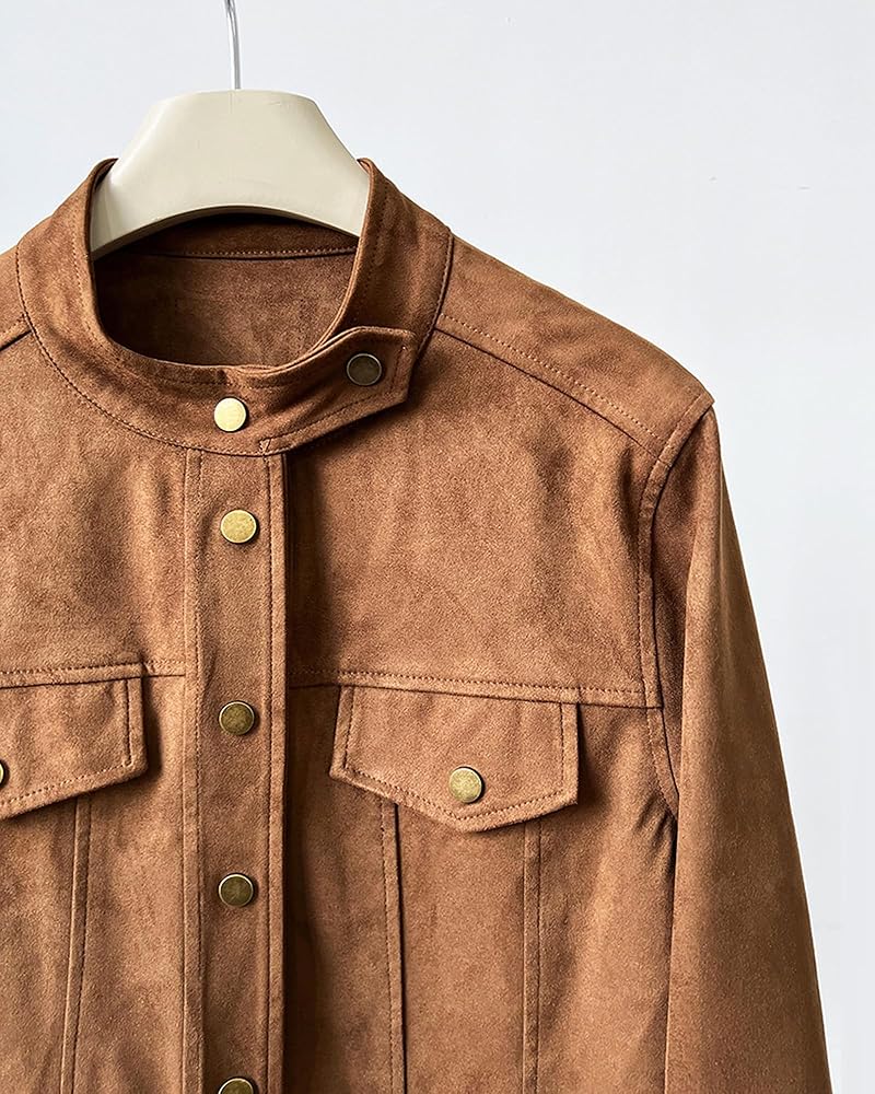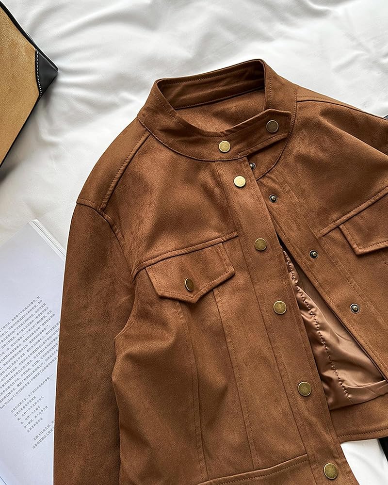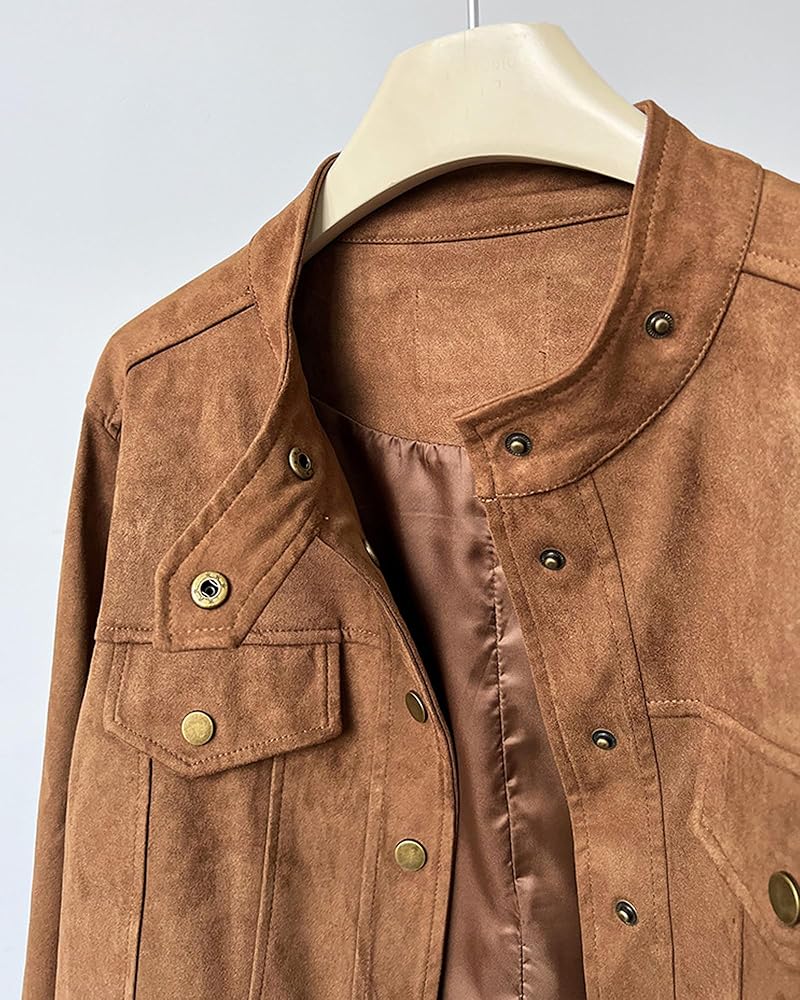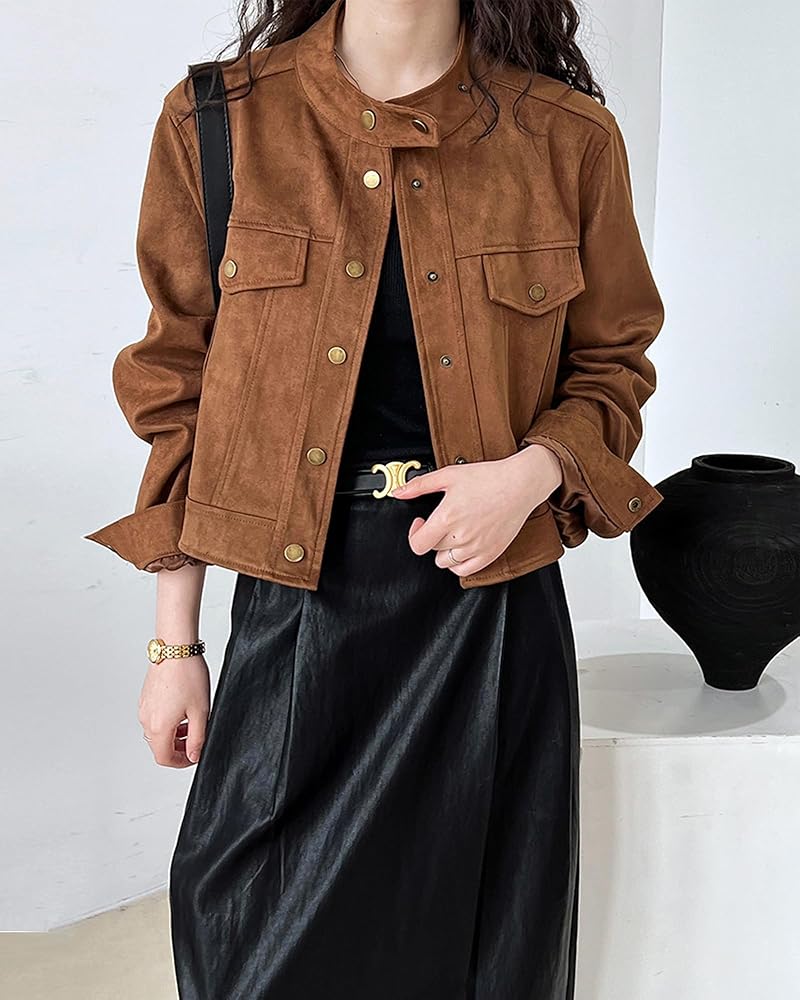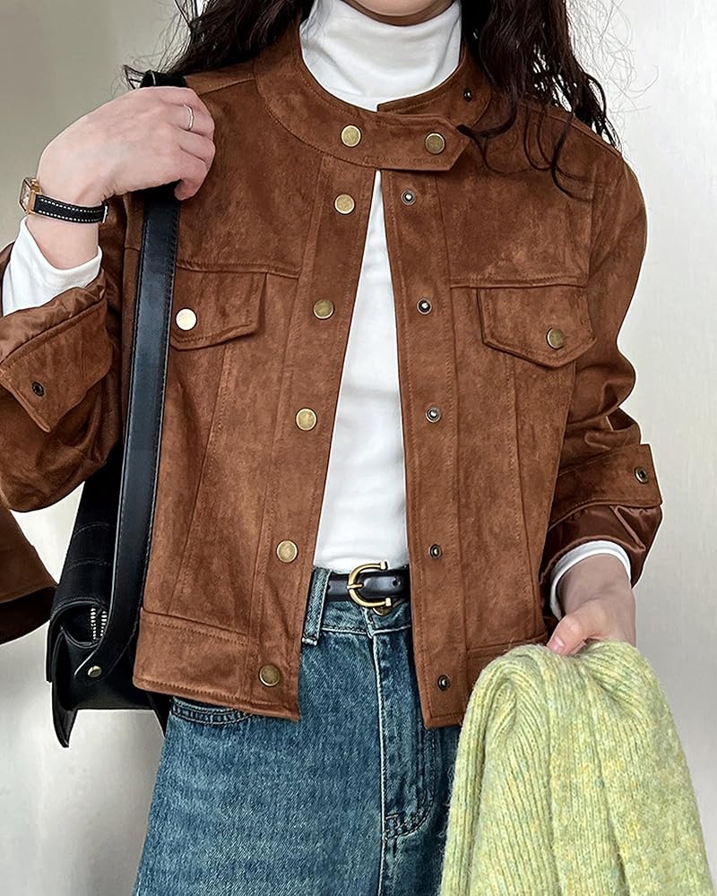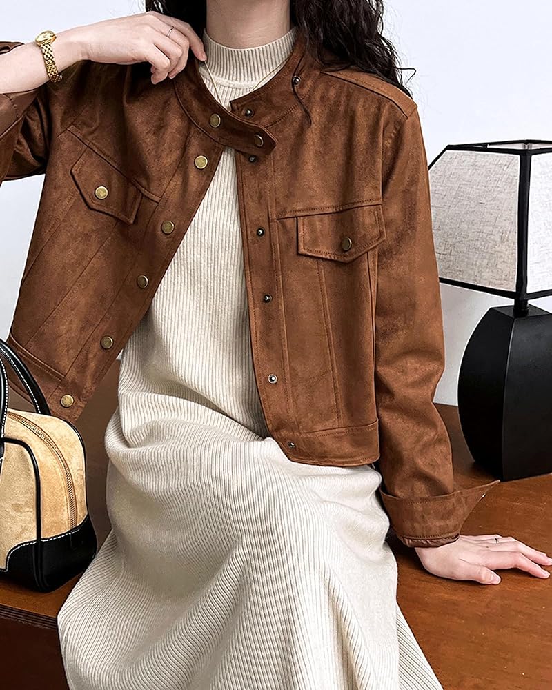 • التصميم: سترات قصيرة كلاسيكية، سترة نسائية من الجلد السويدي، سترة موتوكروس، سترة بزر كبس، جيوب وهمية على الصدر، أكمام طويلة، ياقة واقفة، معطف دراجة نارية عصري Y2K. تتميز هذه السترة النسائية القصيرة المصنوعة من الجلد السويدي بنمط دراجة نارية عصري