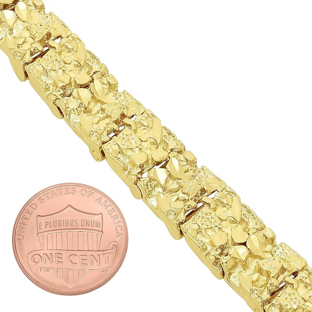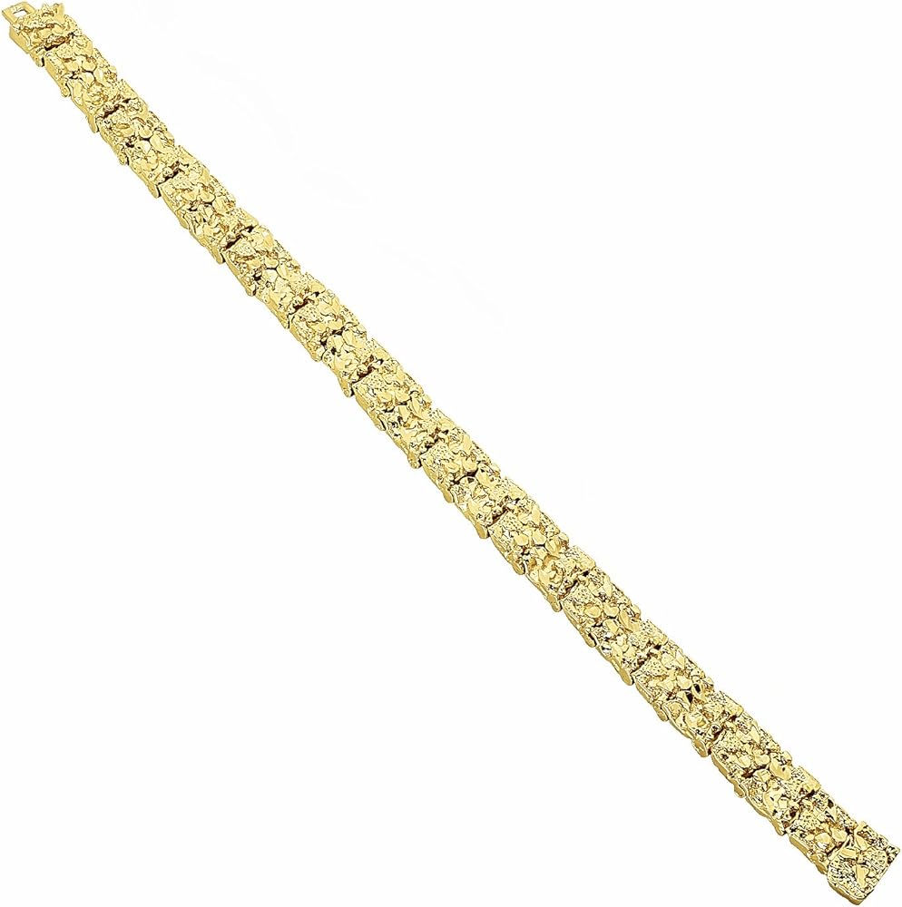 Available in a variety of lengths to ensure a more customized fit, this chunky 11mm 14k yellow gold plated bracelet features watchband style links that glisten from a multi-dimensional nugget texture. It's fastened by a secure and seamless box clasp.