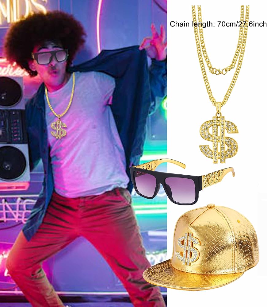 【مجموعة أزياء هيب هوب من الثمانينيات والتسعينيات】يحتوي الطرد على قبعة بيسبول من جلد التمساح، وقلادة هيب هوب ذهبية مع قلادة دولار ونظارة شمسية ذهبية خشنة. في الثمانينيات، سيسمح لك أسلوب التسعينيات بالخروج من الحفلة.