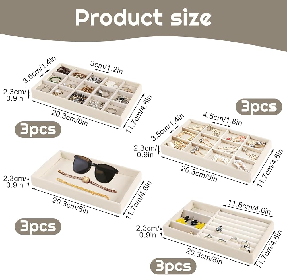 Quantity and Size – This jewelry tray set includes 12 elegant beige velvet stackable jewelry organizers, each measuring 8 x 4.6 x 0.9inches (20.2 x 11.7 x 2.3 cm). These spacious jewelry display trays provide ample room to organize necklaces, rings, bracelets, and more, making storage and selection quick and convenient.