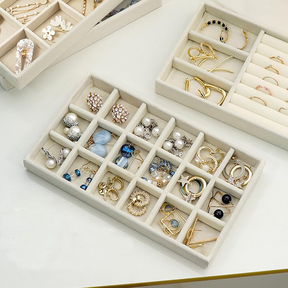 Our 12 premium velvet jewelry trays offer flexible storage for your jewelry collection without dedicated compartments, allowing for custom arrangement. Made from durable, luxurious velvet, they protect your pieces from scratches. Stackable design maximizes storage space, perfect for drawers or shelves. Ideal for organizing earrings, rings, and necklaces, these trays make a thoughtful gift for birthdays, weddings, and anniversaries.