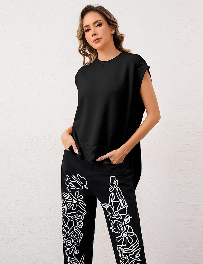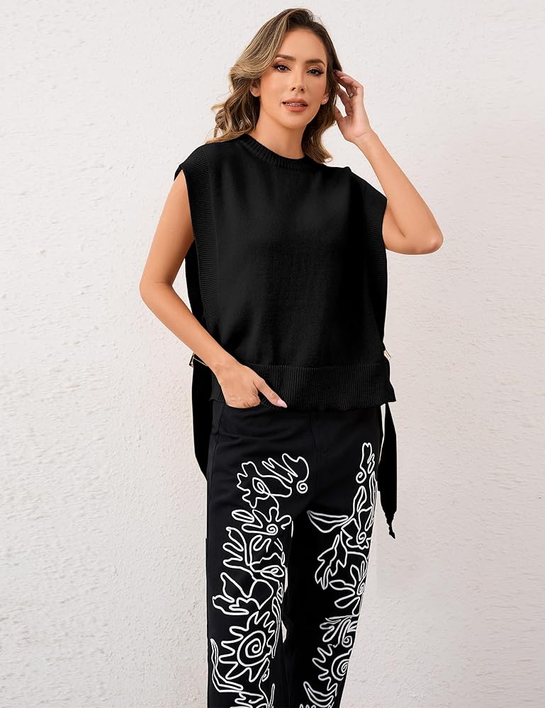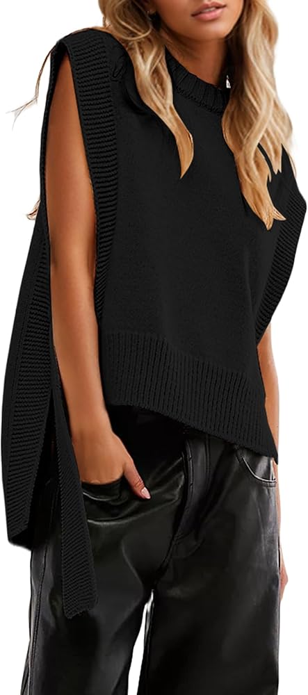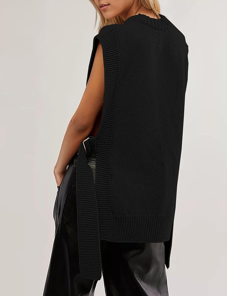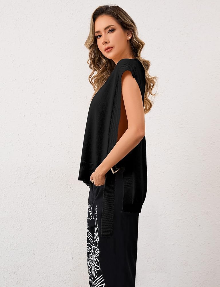 سترة نسائية من Livtany بدون أكمام ورقبة دائرية، مقاس كبير، بحاشية عالية ومنخفضة، ملابس خريفية سادة مع ربطة جانبية باللون الأسود