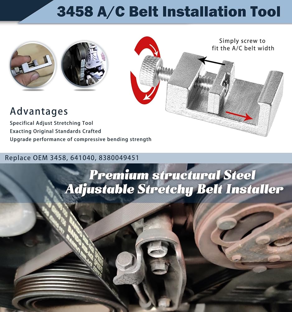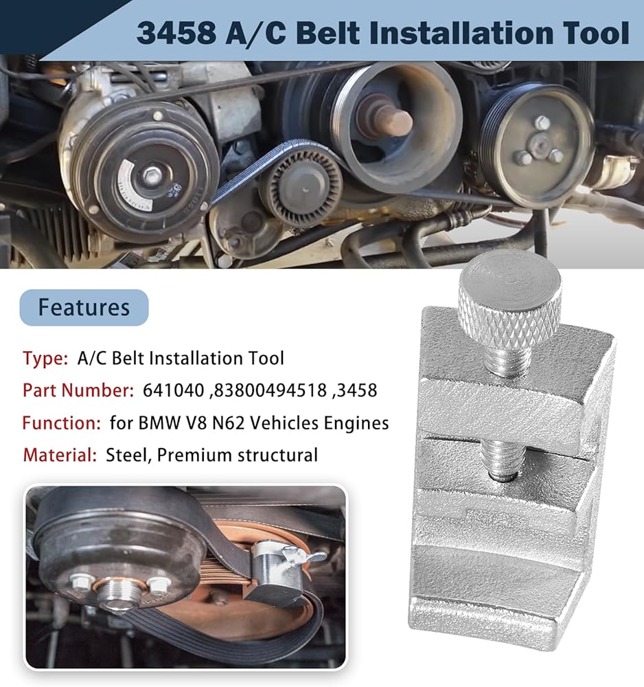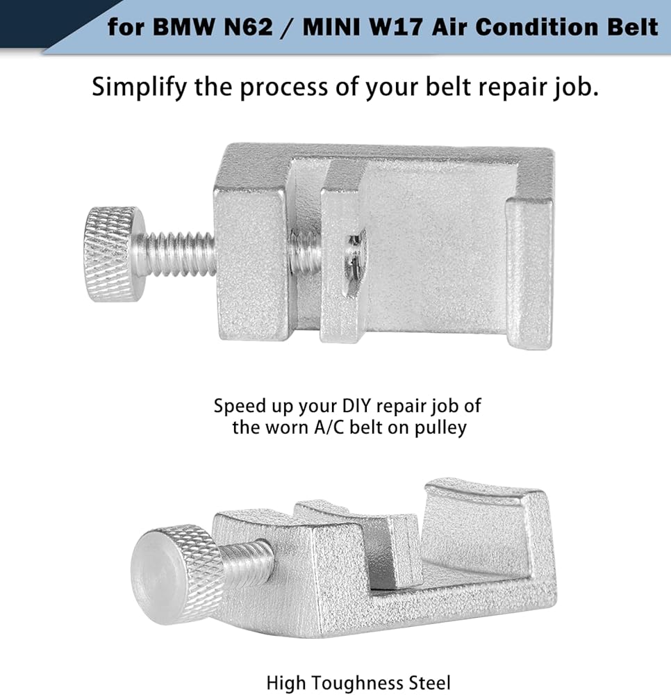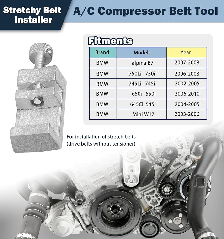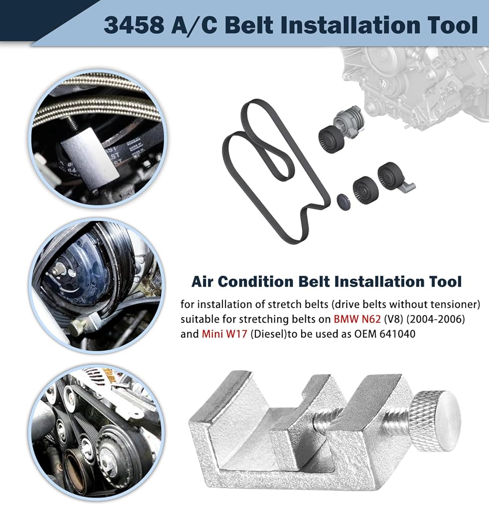 【Function】Used for installing the A/C belt on the compressor without a belt tensioner. If your N62-powered engine does not have a tensioner for the A/C belt you will need this tool.Effortless stretch of the belt over the A/C compressor pulley