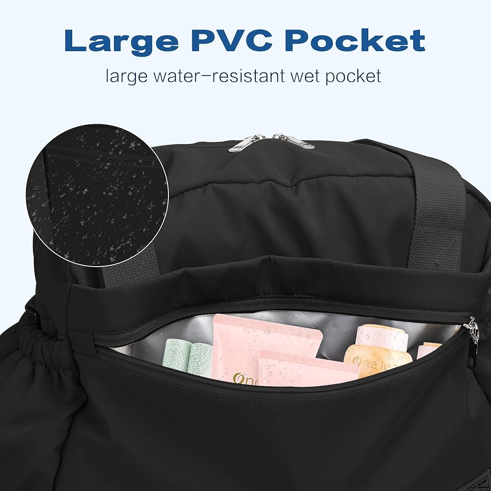 تحقق حقيبة الصالة الرياضية فصلًا جافًا ورطبًا، وجيب PVC الموجود في الأمام عبارة عن قسم منفصل للحفاظ على العناصر المبللة أو المناشف منفصلة. النايلون المقاوم للماء يجعل حقيبة التمرين هذه رائعة في كل مكان