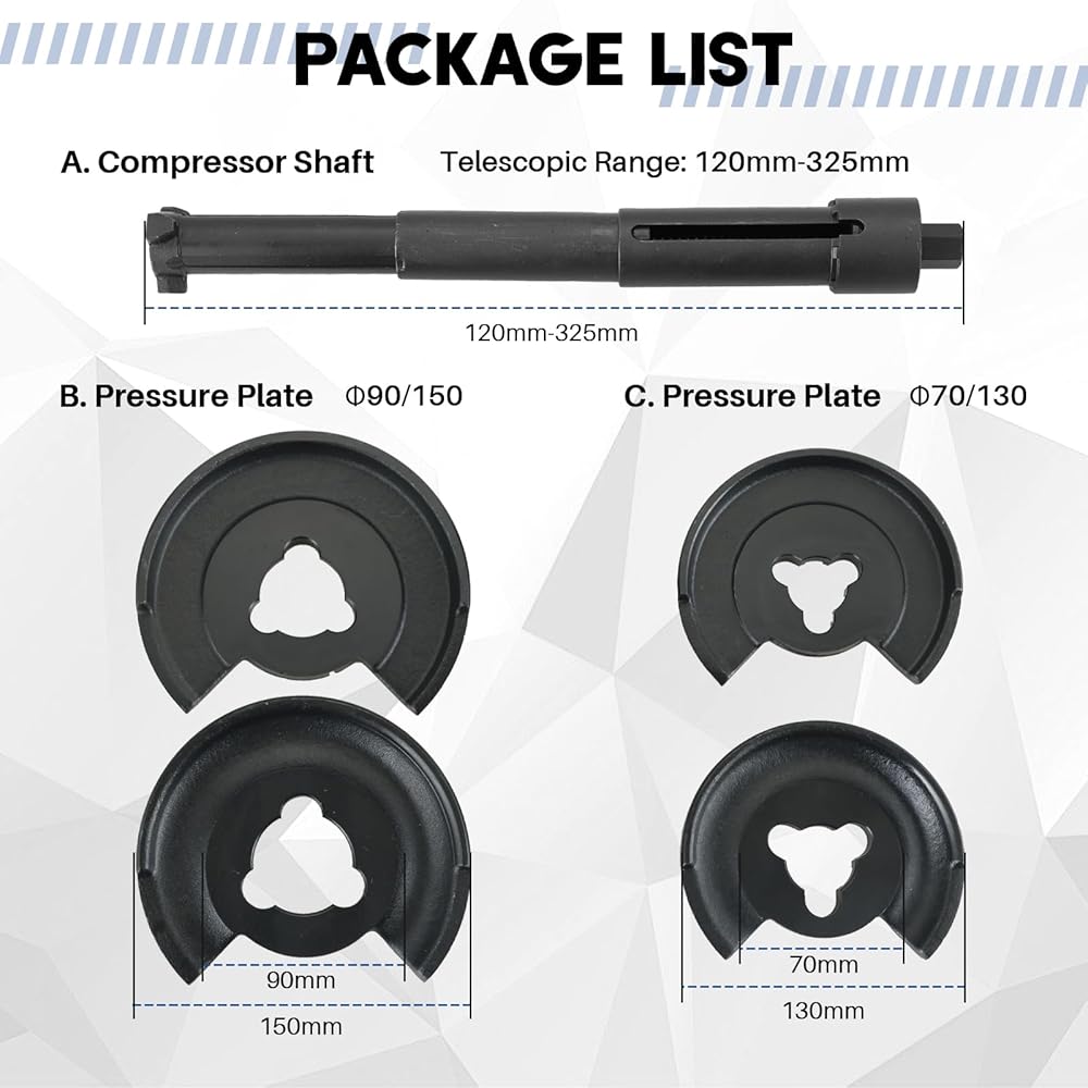 【المقاس】 تتضمن مجموعة أدوات الإصلاح التليسكوبية للضاغط الزنبركي ذات الملف الدعامي لوحتين مقاس 90/150 مم ولوحتين مقاس 70/130 مم. نطاق تلسكوبي 120 مم - 325 مم.