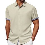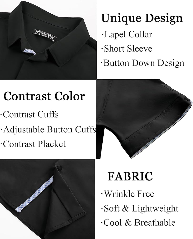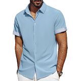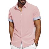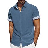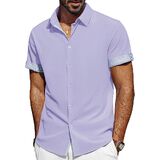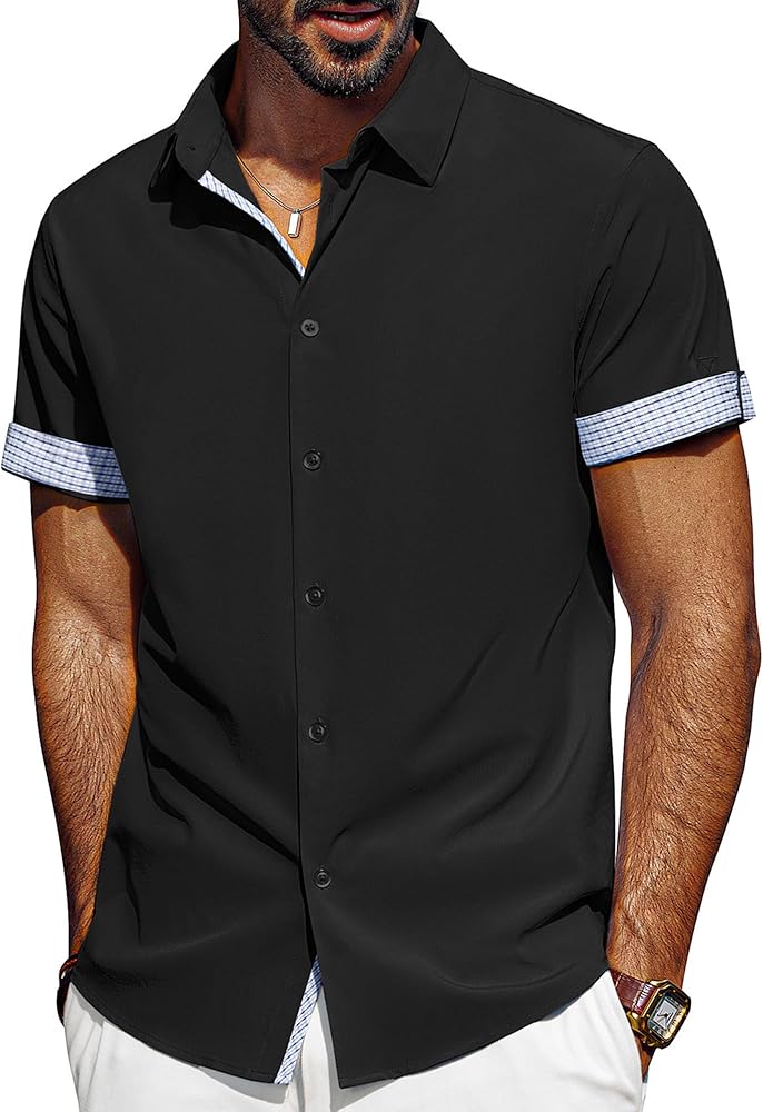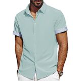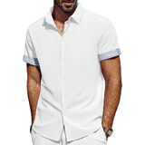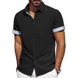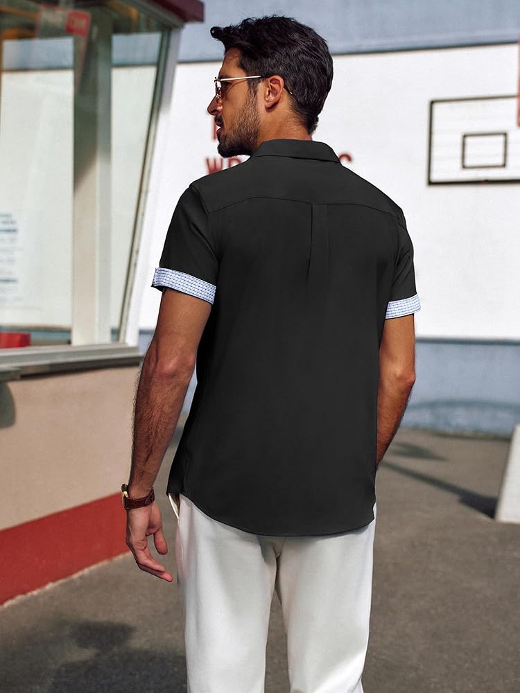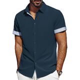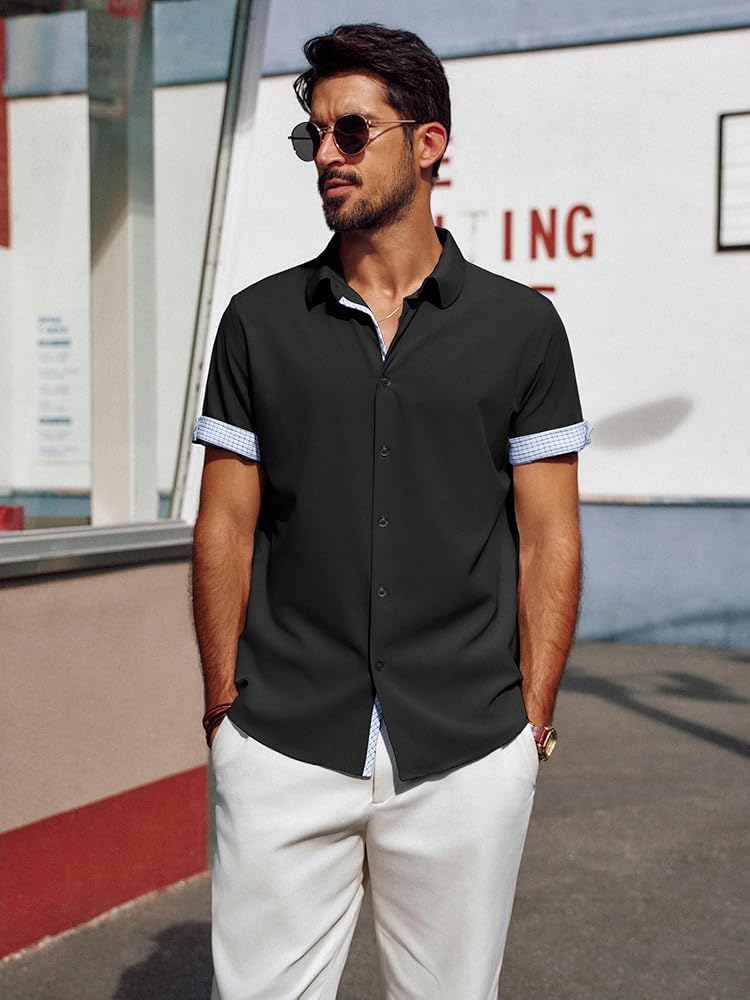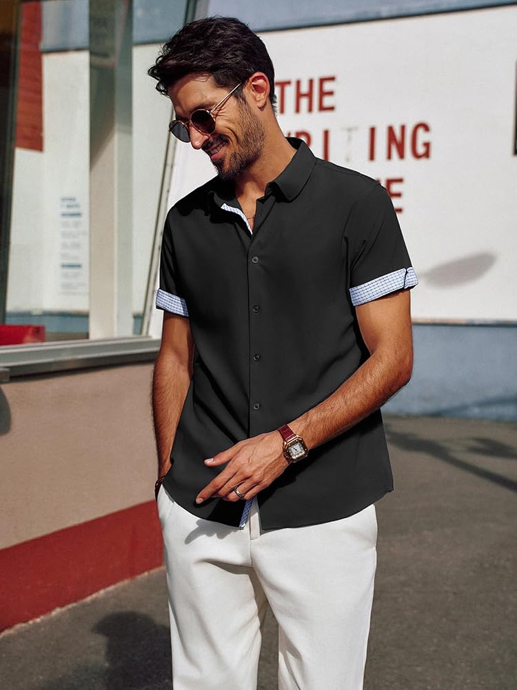 تصميم فريد: تتميز القمصان الرجالية بأكمام قصيرة، ونمط قصة عادية، وإغلاق بأزرار لأعلى، وحاشية منحنية، وتصميم على شكل حرف "H" وياقة منتشرة مما يمنحها شعورًا كلاسيكيًا بلمسة عصرية. تتميز الفتحة وأساور الأكمام بتصميم منقوش بألوان متباينة، ويمكنك ضبط أساور الأكمام ذات الأزرار أو رفع الأساور لإظهار التباين في الداخل، مما يضيف عنصرًا لافتًا للنظر إلى أي ملابس. تعتبر القمصان الرجالية غير الرسمية رائعة للأيام الدافئة أو يمكن ارتداؤها تحت سترة خلال الأشهر الباردة