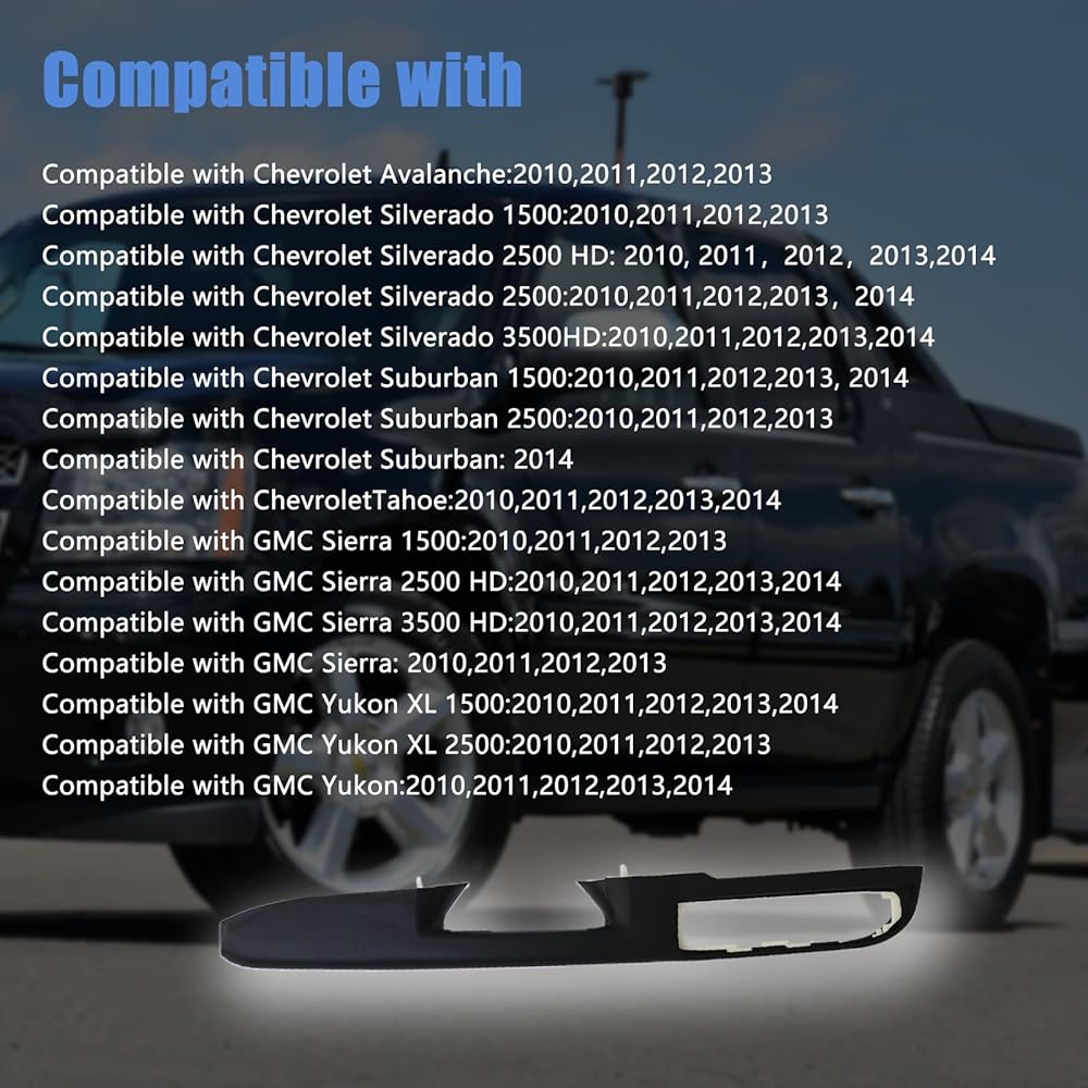 التوافق: مناسب لسيارة جي إم سي سييرا 2010-2013 /1500 2010-2013 / 2500 HD 2010-2014 / 3500 HD 2010-2014، جي إم سي يوكون 2010-2014 / XL1500 2010-2014 / XL 2500 2010-2013؛ لسيارة تشيفي أفالانش 2010-2013، سيلفرادو 1500 2010-2013 / 2500 HD 2010-2014 / 2500 2010-2014 / 3500 HD 2010-2014، الضواحي 2014 / 1500 2010-2014 / 2500 2010-2013، تاهو 2010-2014