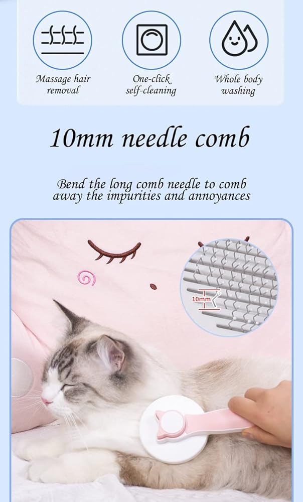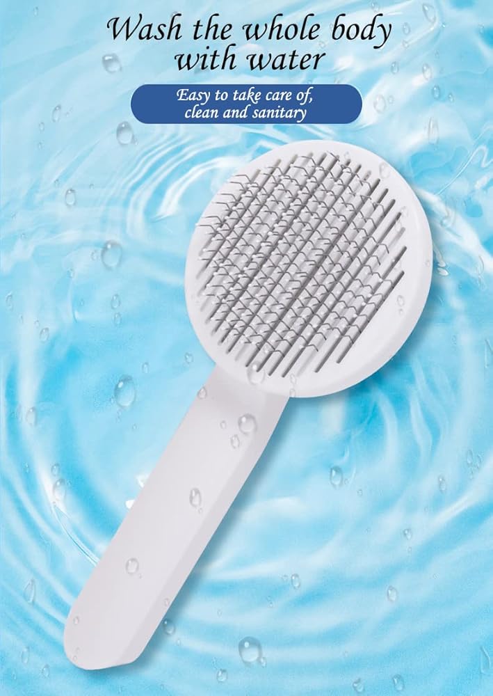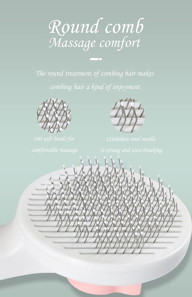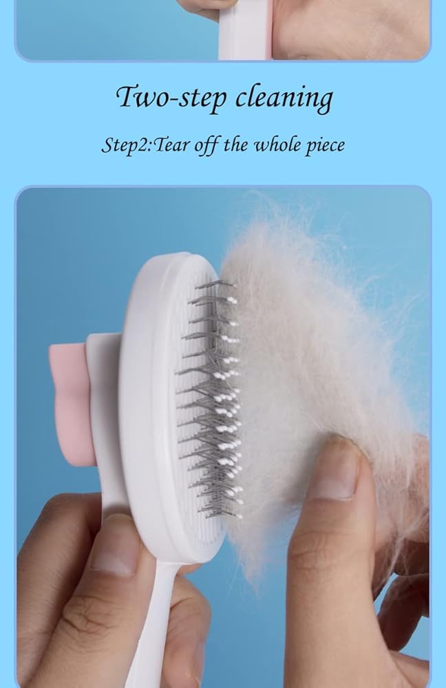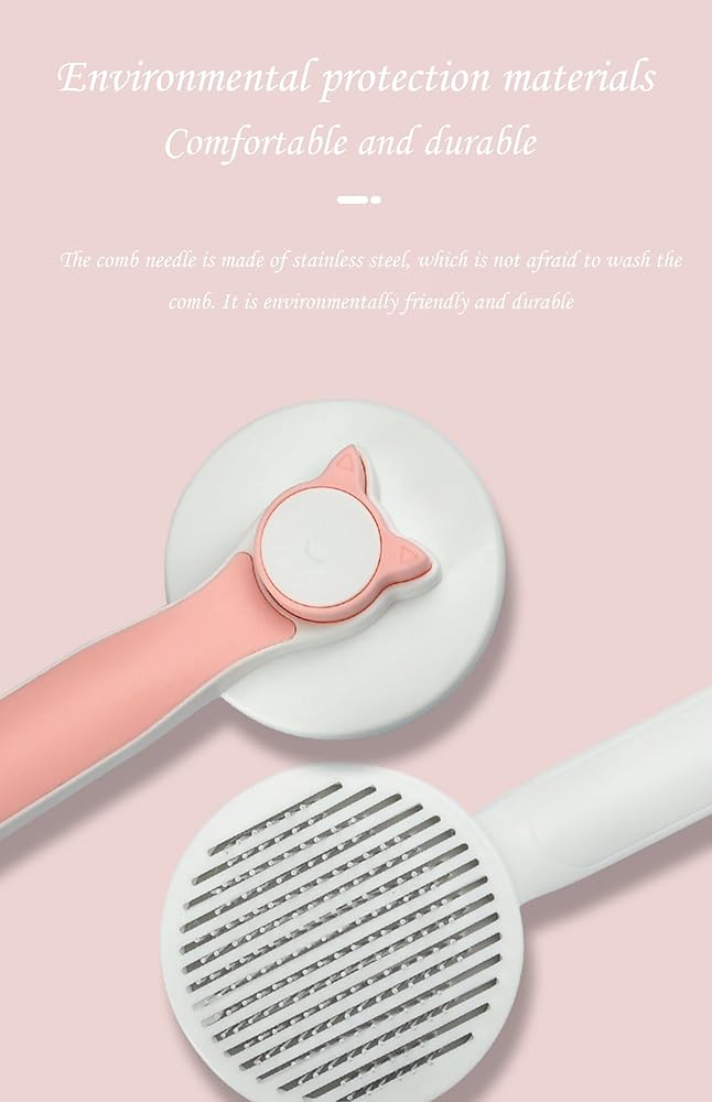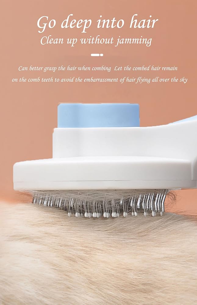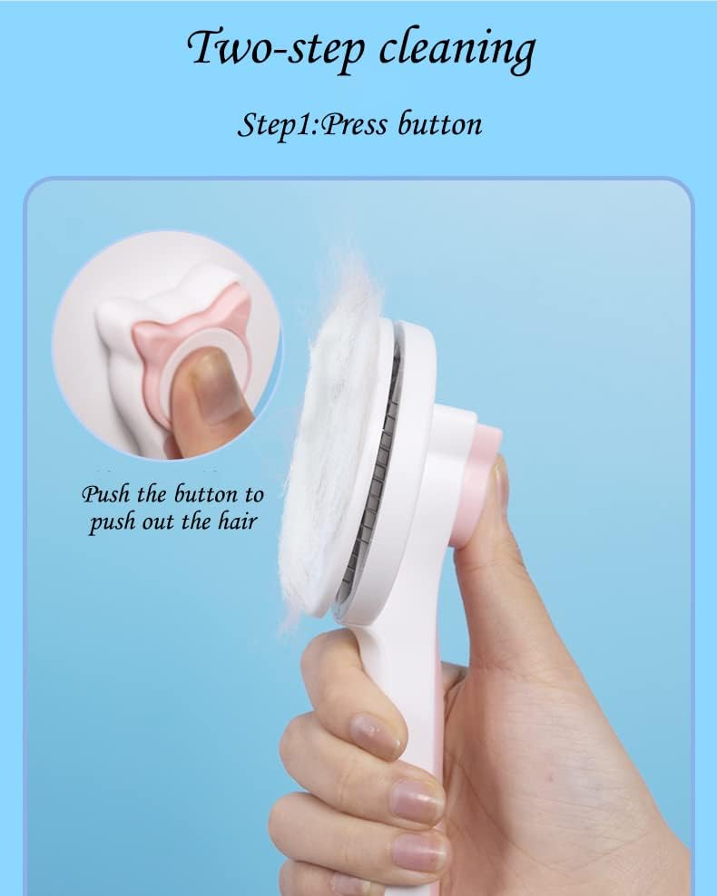 • زر التنظيف بنقرة واحدة: بعد تنظيف الحيوان الأليف بالفرشاة. ما عليك سوى الضغط على الزر لفصل الشعر عن الإبرة المعدنية، مما يوفر الوقت والجهد أثناء التنظيف