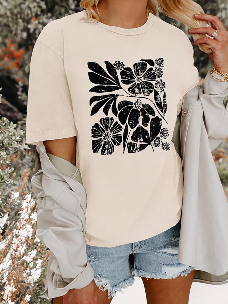 تصميم كاجوال برقبة دائرية مع القليل من التفاصيل المزعجة على الطباعة جعل هذا التي شيرت ذو الأكمام القصيرة أكثر طرازًا عتيقًا وعتيقًا.