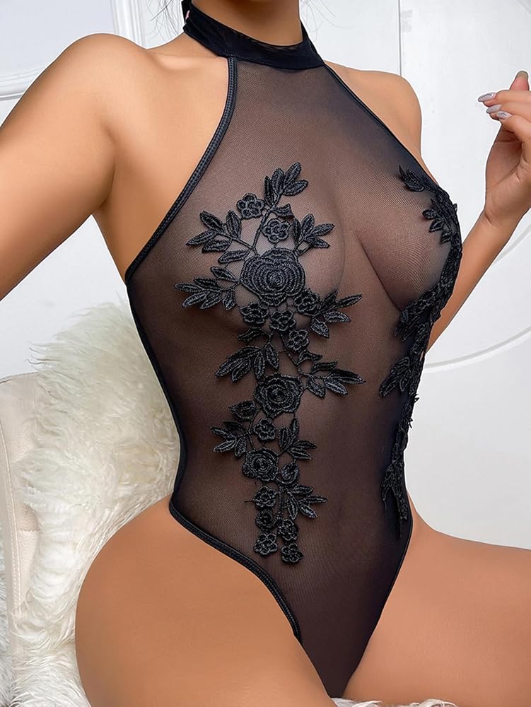 Features: This Lingerie for Women Teddy features a halter neck, backless design, sleeveless, flower embroidery, see through, sheer mesh, snap closure at the crotch, fitted design