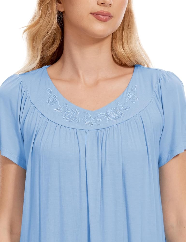 السمات: فساتين نوم قصيرة الأكمام للنساء مزينة بتطريز البتلات على خط الرقبة الدائري وتجمعات أنيقة لإبراز جمالك الأنثوي