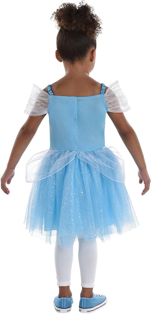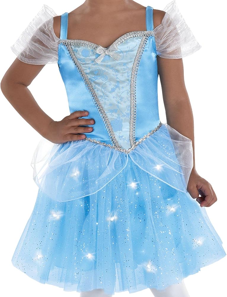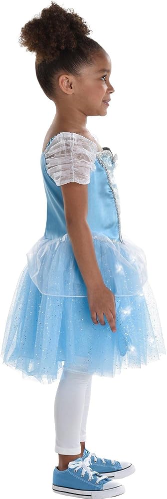 • Fairy Tale Dreams: Party City Kids' Light-Up Cinderella Costume transforms your little one into a beloved princess. The blue satin dress features organza details, silver trim, and a puffy tutu-style skirt that lights up with the press of a button. Size 3-4T.