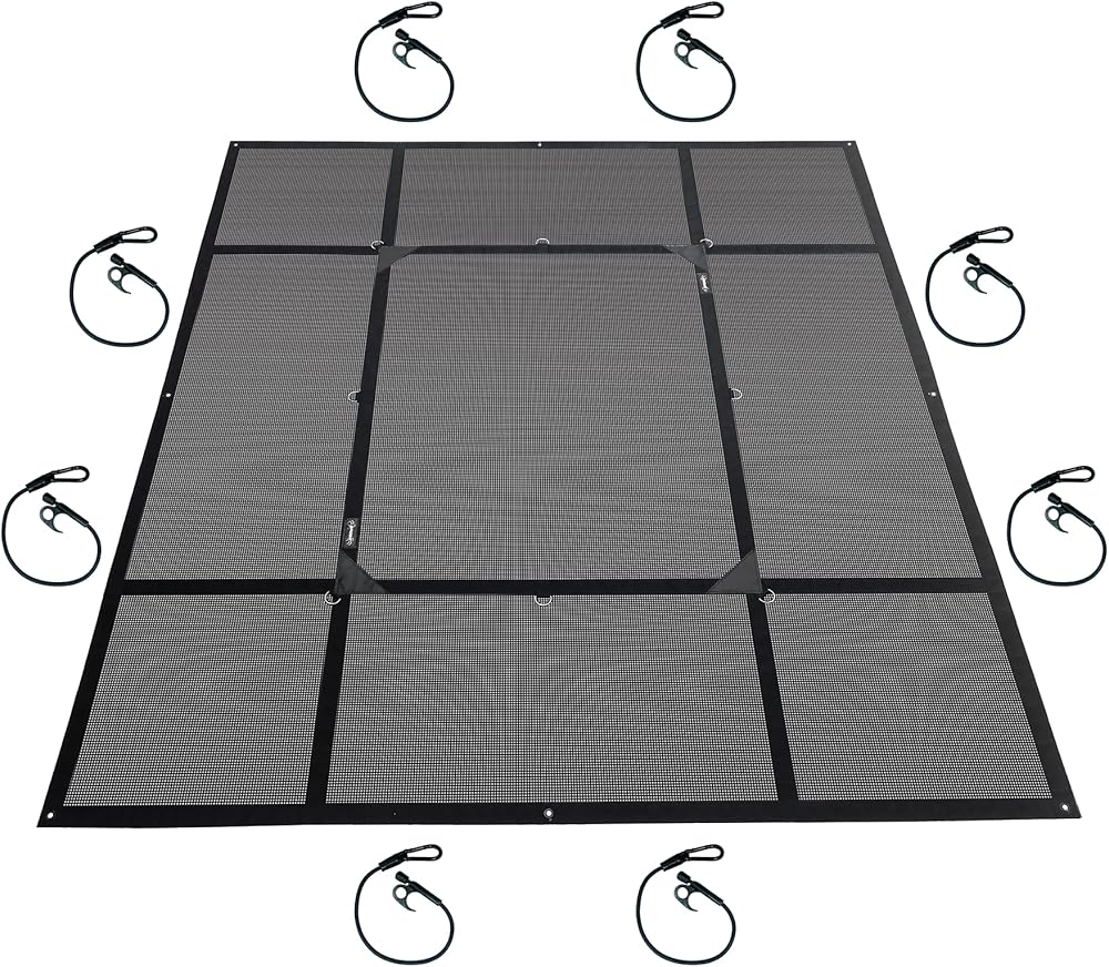 • متين - غطاء متين مقاوم للأشعة فوق البنفسجية والتمزق ولا يسبب أي تمزق من الفينيل بوزن 15 أونصة مع حزام داخلي ومحيط مقاس 2 بوصة للحصول على قوة غطاء فائقة وثبات الحواف. حبال ربط مرنة مقاومة للتآكل بقطر 5/16 بوصة ومزودة بخطافات نايلون صلبة عالية القوة قابلة للتعديل غير قابلة للخدش وحلقات تسلق فولاذية مقاومة للتآكل.