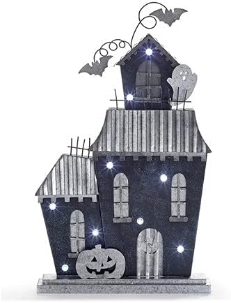 DetailsHand-painted black and silver galvanized laser-cut tin and galvanized corrugated tin haunted house with jack-o'-lantern, ghost, and bats. Illuminates. LED. On/off switch. Requires 3–AAA batteries, not included. 25"H x 15.5"W x 2.5"DEach.