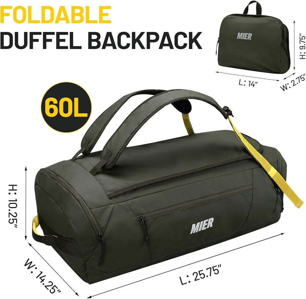 قابلة للطي وقابلة للطي ---- حجم حقيبة السفر: 25.75*14.25*10.25 بوصة بسعة 60 لتر. تتيح لك ميزة الطي المبتكرة وضعها في الجيب الجانبي عند عدم الاستخدام. بعد طيها، يمكن تخزينها في درج/خزانة/صندوق السيارة/حقيبة حمل، قل وداعًا للحقائب الكبيرة وحزم الحقيبة في ثانية!