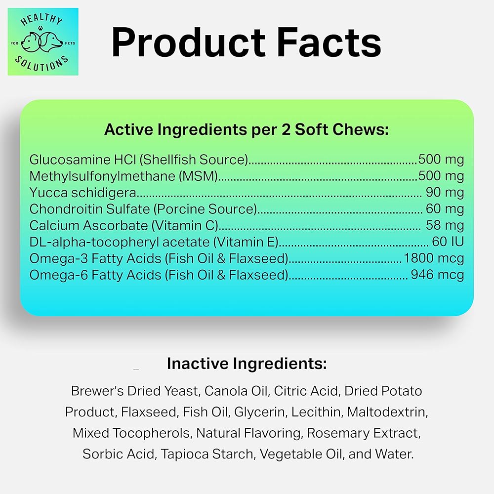 🗸 تم تركيبه بواسطة طبيب بيطري بمكونات عالية الجودة تدعم الحركة الصحية والغضاريف وصحة المفاصل، بما في ذلك الجلوكوزامين والكوندرويتين وميثيل سلفونيل ميثان. -- 60 مضغة ناعمة