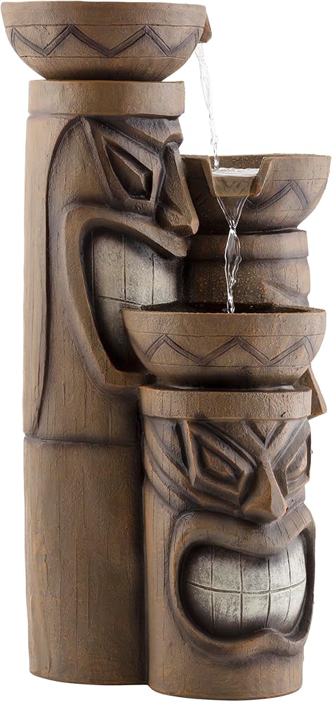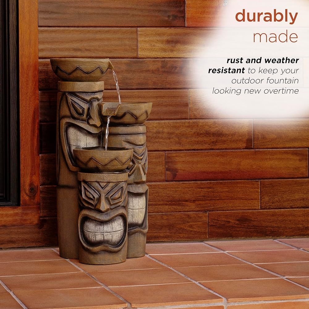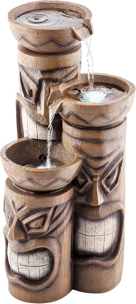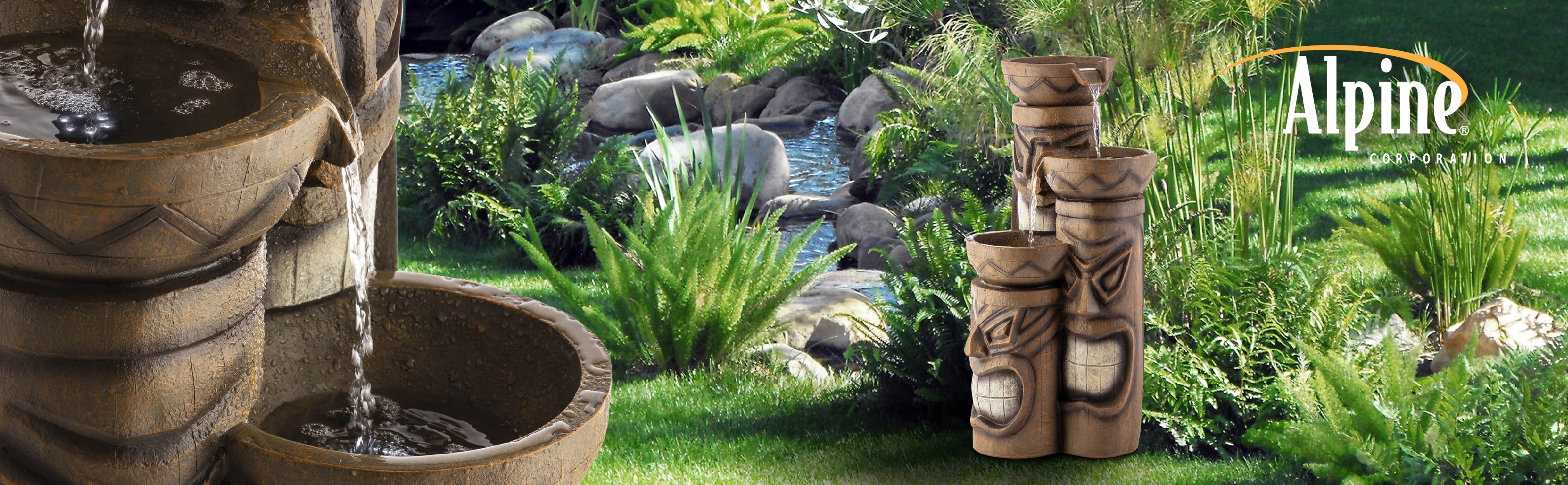 Add a touch of island fun to your outdoor space with the Alpine Corporation Tiki Head Fountain. Guests will be serenaded by the cascading streams and will feel like they are in the middle of the beach in Hawaii next to a tiki bar! This outdoor fountain looks great in your garden, patio, deck, porch, or yard space. Enjoy the sound of trickling water that pours from rounded bowls sitting atop three levels of tiki totem heads. The polyresin, stone powder, and fiberglass construction is weather-proof, rust-resistant, and durable for years of quality use. The weight of the fountain and sturdy base allow it to stay upright in the strongest wind. LED lights in each of the 3 tiers illuminate your space, drawing attention to the relaxing water pools day or night for added ambiance. To use, simply plug into an outdoor outlet, fill upper level with water, and watch as the interior pump creates a lovely water flow. With a 2-year warranty, you can be confident in the quality of your purchase. Fountain measures 15"L x 15"W x 29"H for use in yards of any size. Alpine Corporation is one of America's leading designers, importers, and distributors of superior quality home and garden decor products. Alpine Corporation's award winning in-house design team continuously develops new and innovative "statement pieces" for your home and garden. Your indoor and outdoor living spaces will be the envy of the neighborhood with our wide assortment of fresh, fashionable and contemporary products, from beautifully crafted solar garden stakes featuring patented motion and fiber optic lighting technology to beautiful fountains and delightful bird baths and feeders.