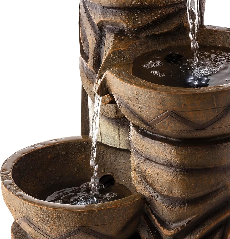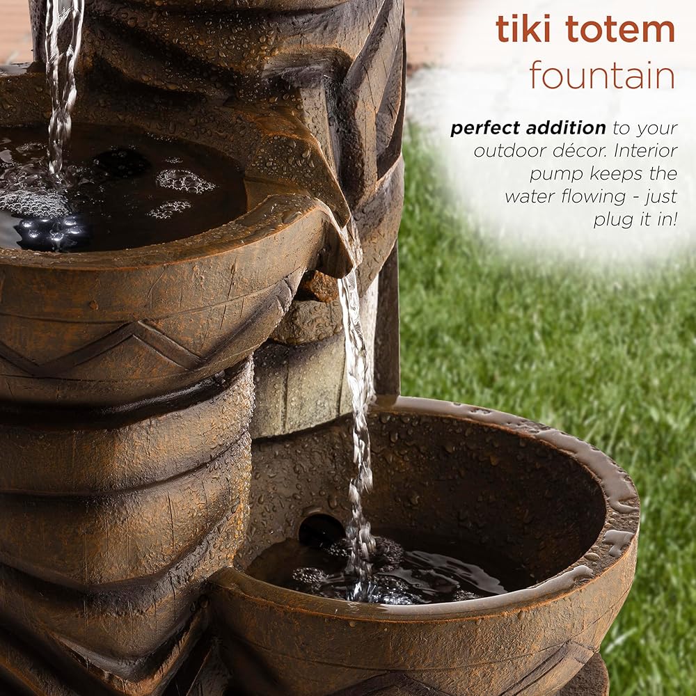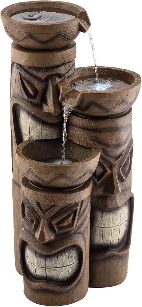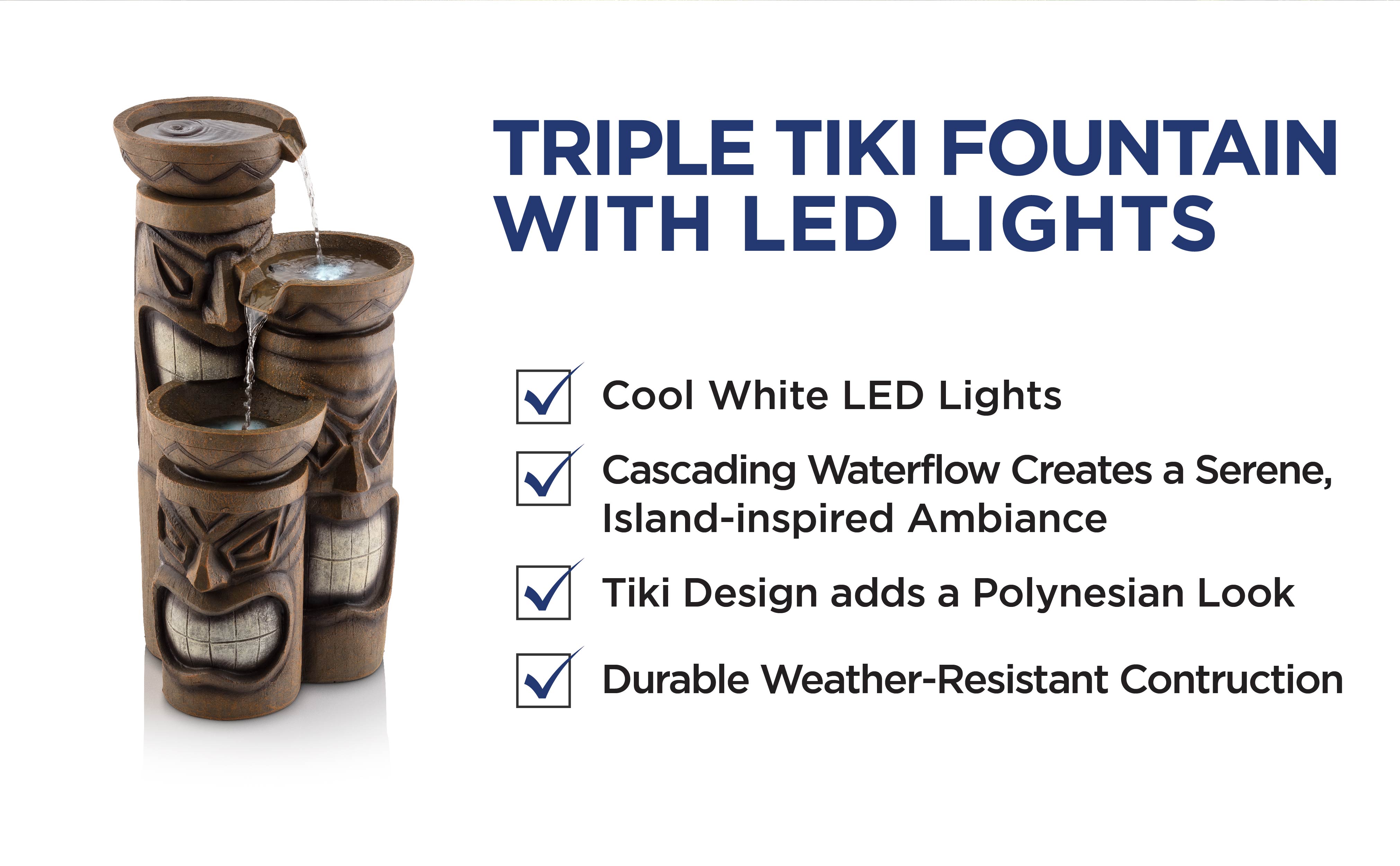 Add a touch of island fun to your outdoor space with the Alpine Corporation Tiki Head Fountain. Guests will be serenaded by the cascading streams and will feel like they are in the middle of the beach in Hawaii next to a tiki bar! This outdoor fountain looks great in your garden, patio, deck, porch, or yard space. Enjoy the sound of trickling water that pours from rounded bowls sitting atop three levels of tiki totem heads. The polyresin, stone powder, and fiberglass construction is weather-proof, rust-resistant, and durable for years of quality use. The weight of the fountain and sturdy base allow it to stay upright in the strongest wind. LED lights in each of the 3 tiers illuminate your space, drawing attention to the relaxing water pools day or night for added ambiance. To use, simply plug into an outdoor outlet, fill upper level with water, and watch as the interior pump creates a lovely water flow. With a 2-year warranty, you can be confident in the quality of your purchase. Fountain measures 15"L x 15"W x 29"H for use in yards of any size. Alpine Corporation is one of America's leading designers, importers, and distributors of superior quality home and garden decor products. Alpine Corporation's award winning in-house design team continuously develops new and innovative "statement pieces" for your home and garden. Your indoor and outdoor living spaces will be the envy of the neighborhood with our wide assortment of fresh, fashionable and contemporary products, from beautifully crafted solar garden stakes featuring patented motion and fiber optic lighting technology to beautiful fountains and delightful bird baths and feeders.