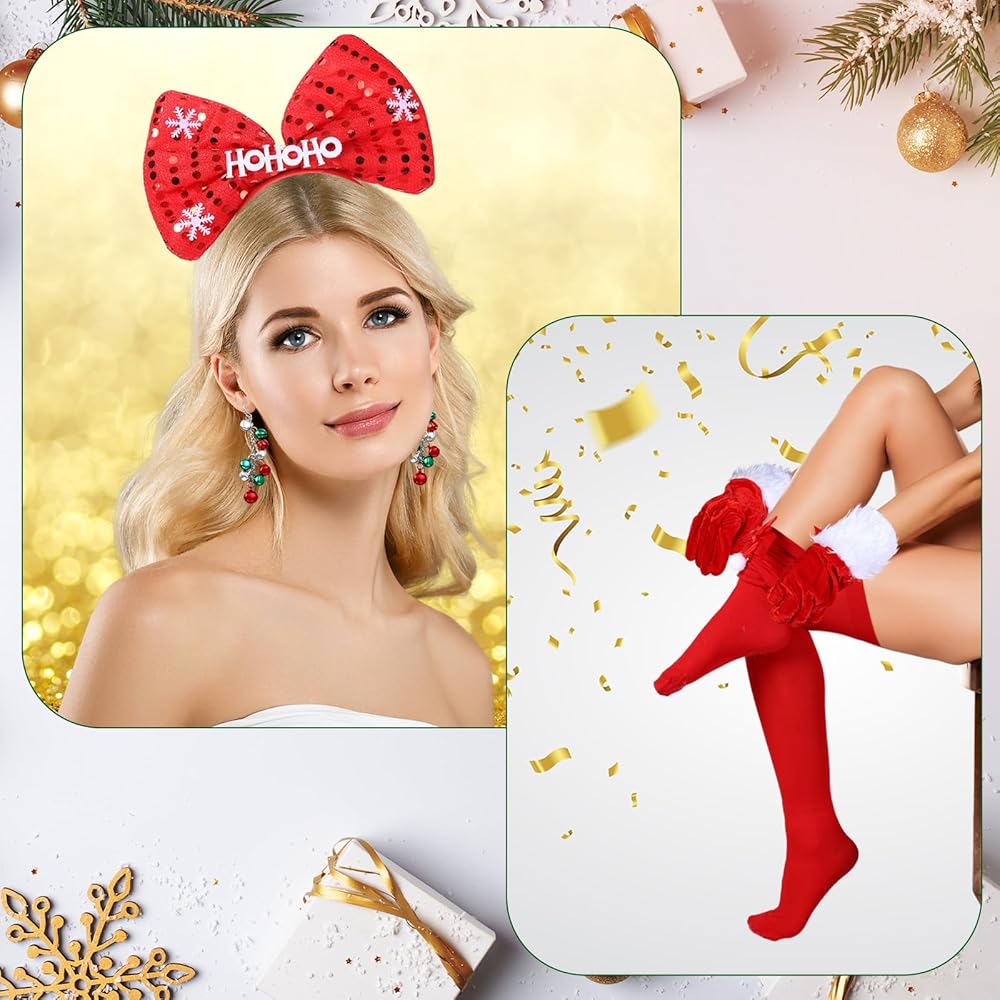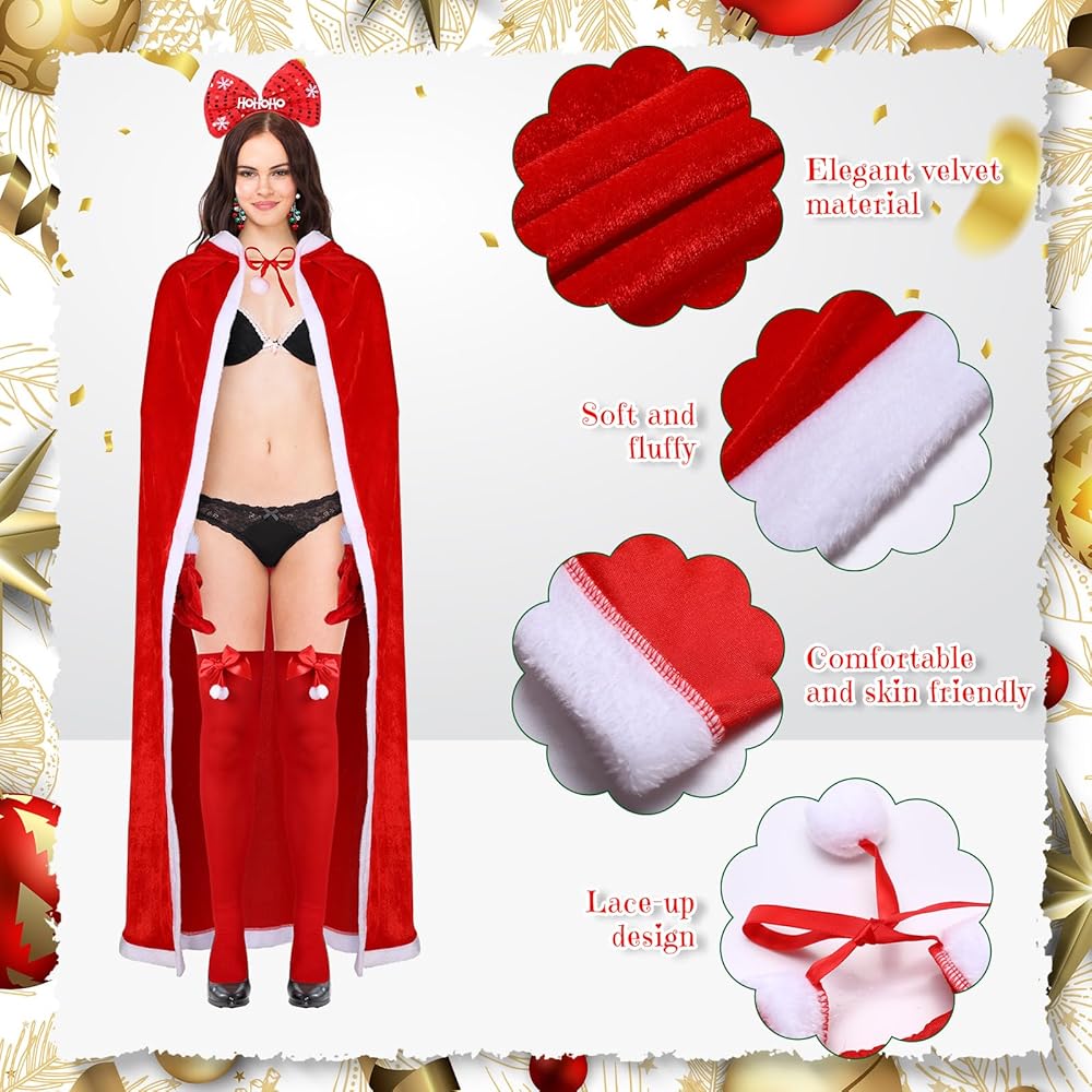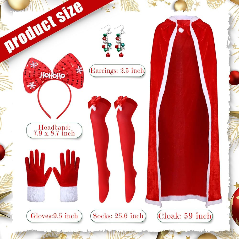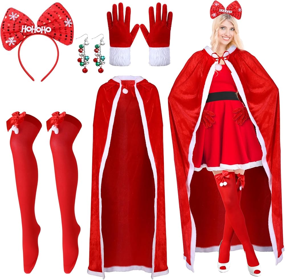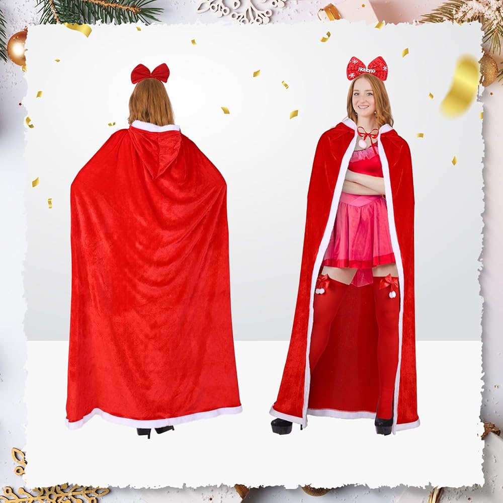 If you want to stand out at a Christmas cosplay party, you can choose our women Christmas outfit sets. The classic Christmas design of the cloak, gloves, and socks, paired with shiny headband and bell earrings, will definitely make you the focus of the Xmas party.