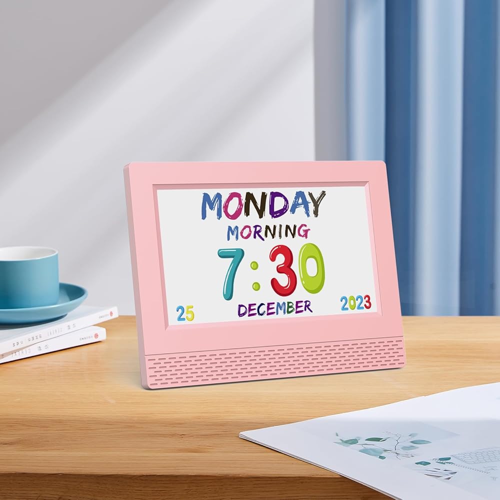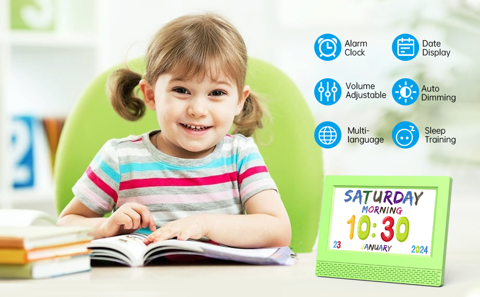 🌟🌟【هدية فريدة للأطفال】-- تستخدم هذه الساعة الرقمية مقاس 7 بوصة خطوط رسوم متحركة ملونة لتمثيل الوقت والتاريخ واليوم والشهر والعام بوضوح دون أي ارتباك. يمكن ضبط الساعة بسهولة باستخدام تنسيقات التاريخ وأنماط الخلفية المختلفة، مما يسمح للأطفال باختيار النمط المفضل لديهم.