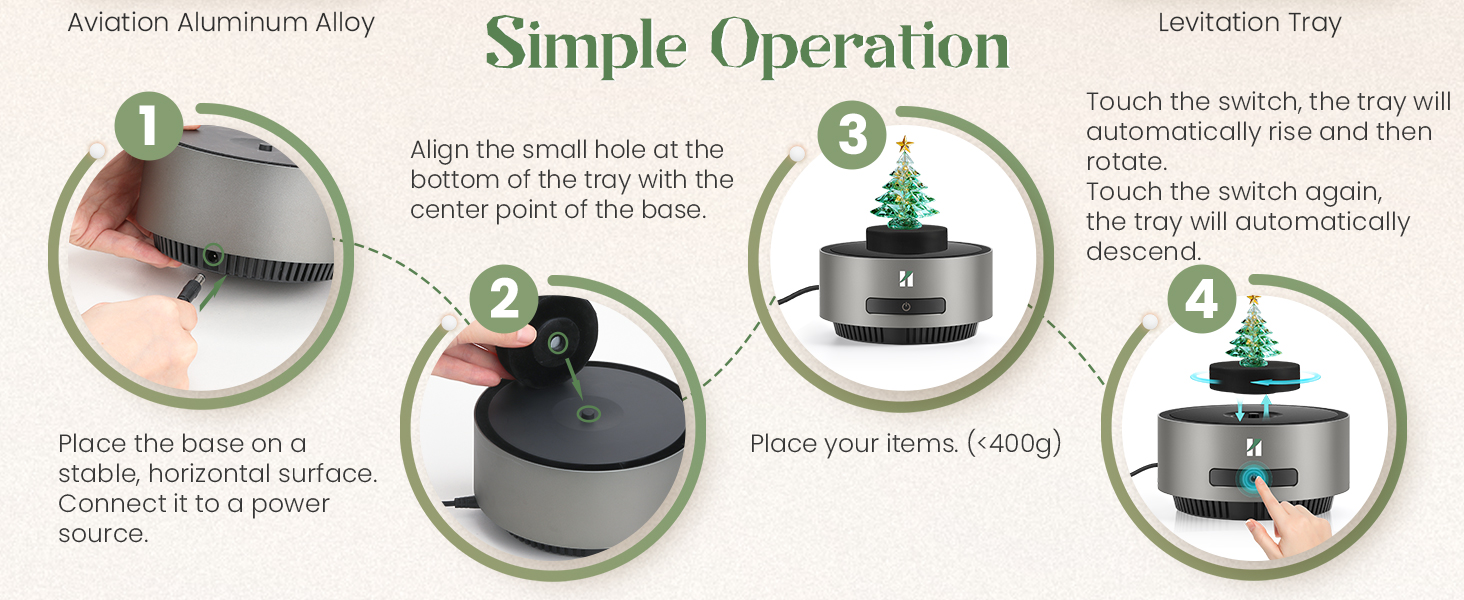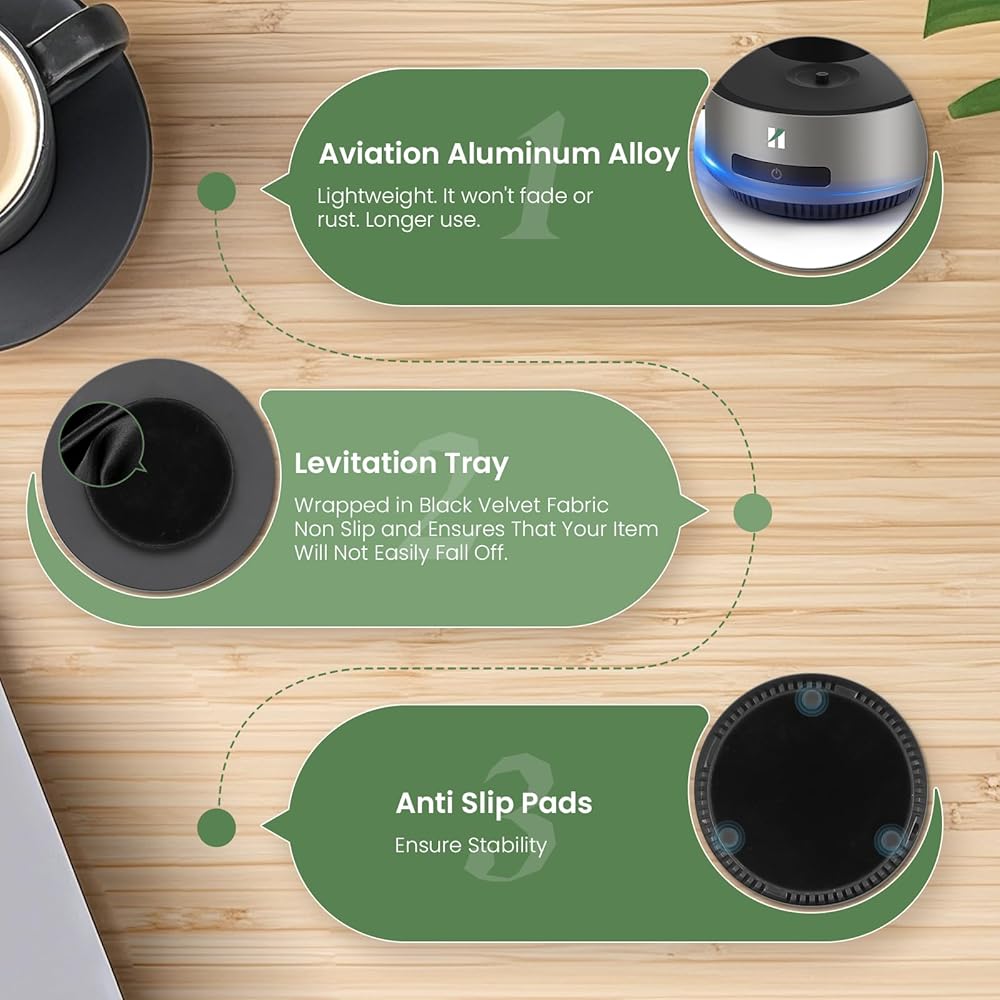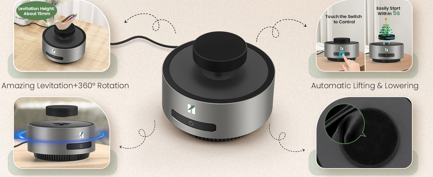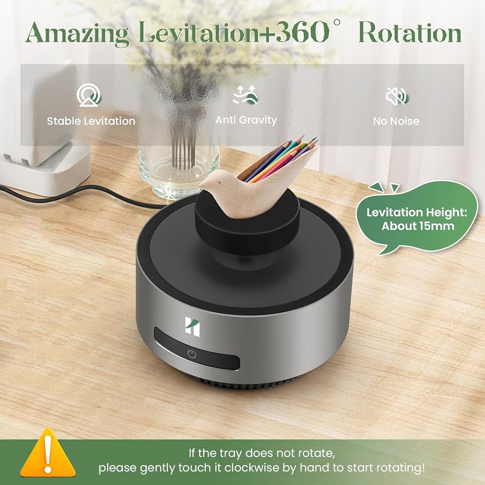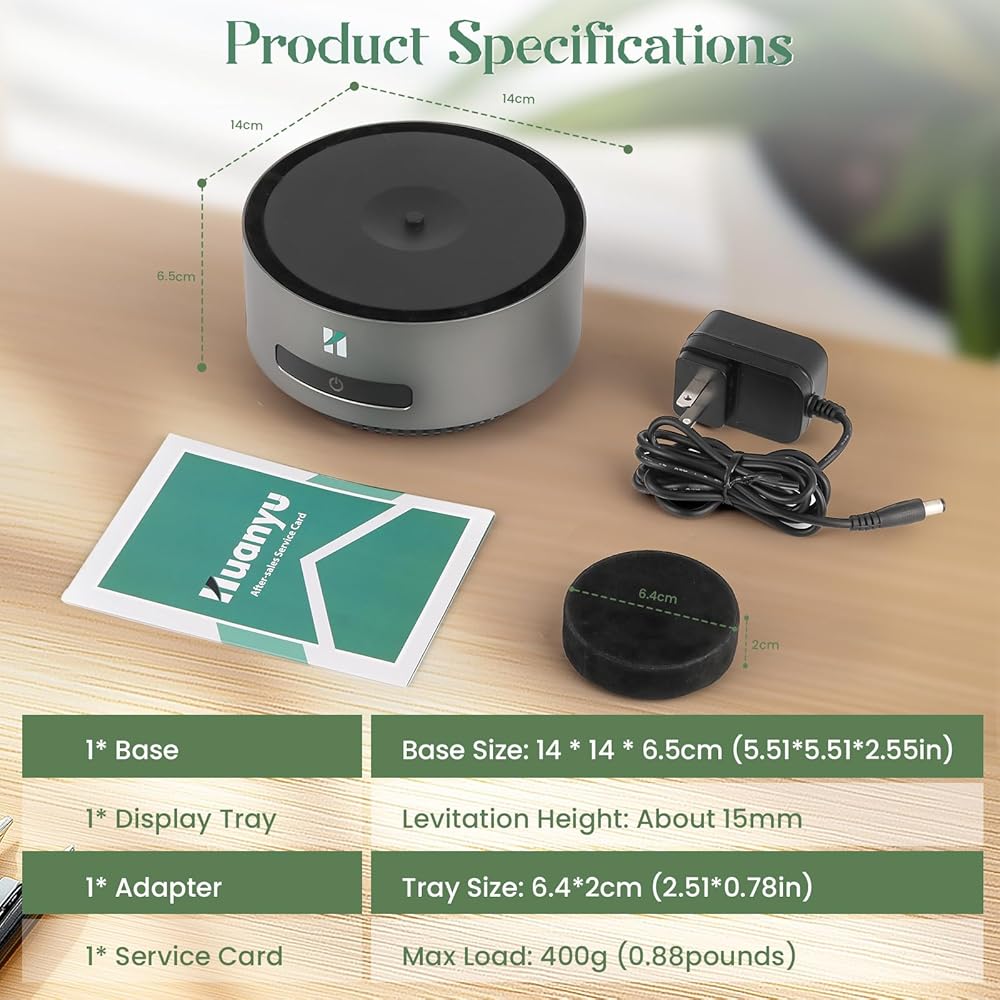 ارتفاع مذهل + دوران 360 درجة: مغناطيس كهربائي مدمج ومستشعر يتيحان للصينية أن تطفو بثبات في الهواء. عائمة ضد الجاذبية. يدور تلقائيًا 360 درجة دون أي ضجيج. انخفاض استهلاك الطاقة وتوفير الطاقة. حجم القاعدة: 14*14*6.5 سم (5.51*5.51*2.55 بوصة)؛ حجم الدرج: 6.4*2 سم (2.51*0.78 بوصة)؛ الحمولة القصوى: 400 جرام (0.88 رطل)