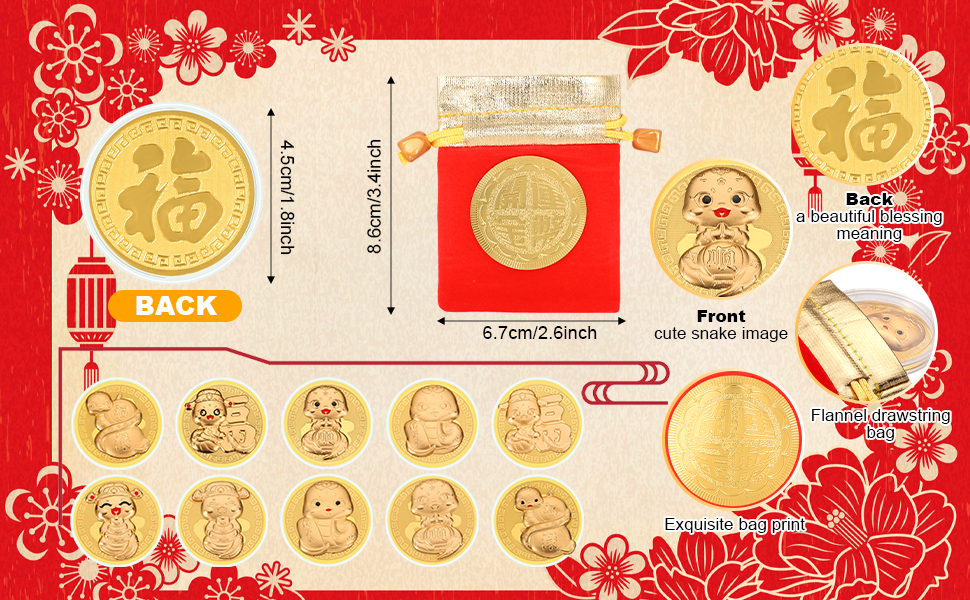معلومات الحجم: يبلغ قطر عملات الثعبان المحظوظة 4.5 سم/1.8 بوصة. مقاس الحقائب ذات الرباط 3.4 × 2.6 سم. إنها مثالية للعرض والتجميع، كما أنها مريحة للحمل معك. ضع عملات زينة فنغ شوي بسهولة في أكياس الرباط وفاجئ أصدقائك وعائلتك بتعليقها.