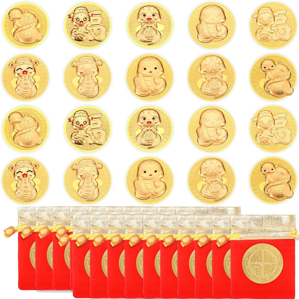 VAIPI 20 قطعة من العملات التذكارية لعام الأفعى - 2025 عملات تذكارية للأبراج الصينية هدايا السنة القمرية الجديدة عملات تزيين Lucky Feng Shui مع أكياس برباط - زخارف السنة الصينية الجديدة