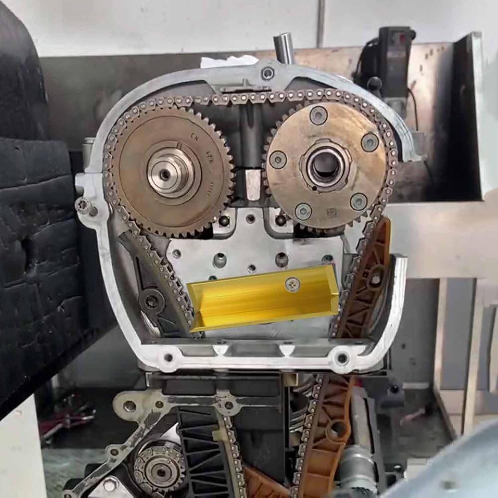 The chain hodling tool can be directly stuck on both sides of the chain, and then slightly rotate the lower crankshaft so that the chain holds it in place., and then insert the screw fixing tool, then you can disassemble the upper part of the engine, such as camshaft, valve cover and so on