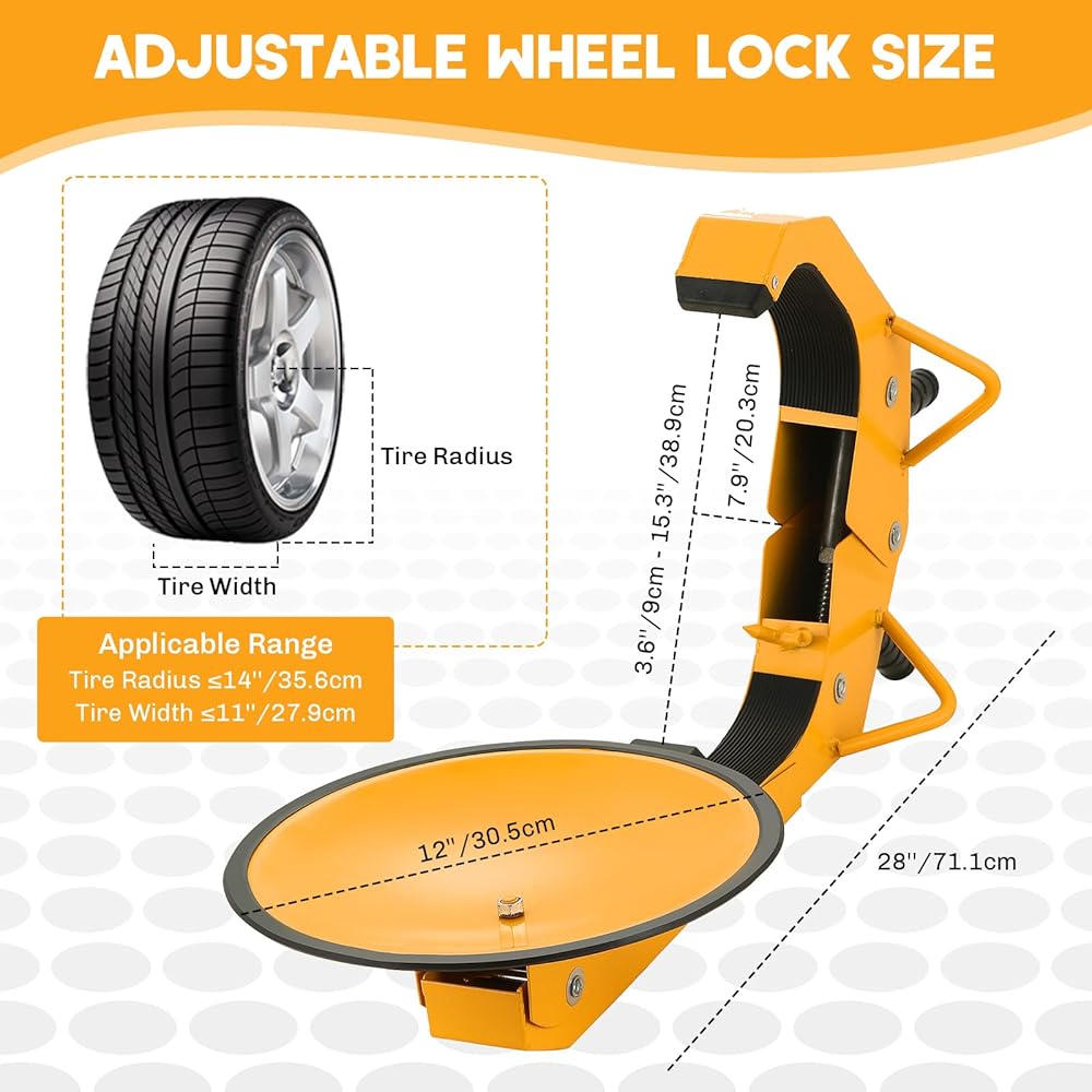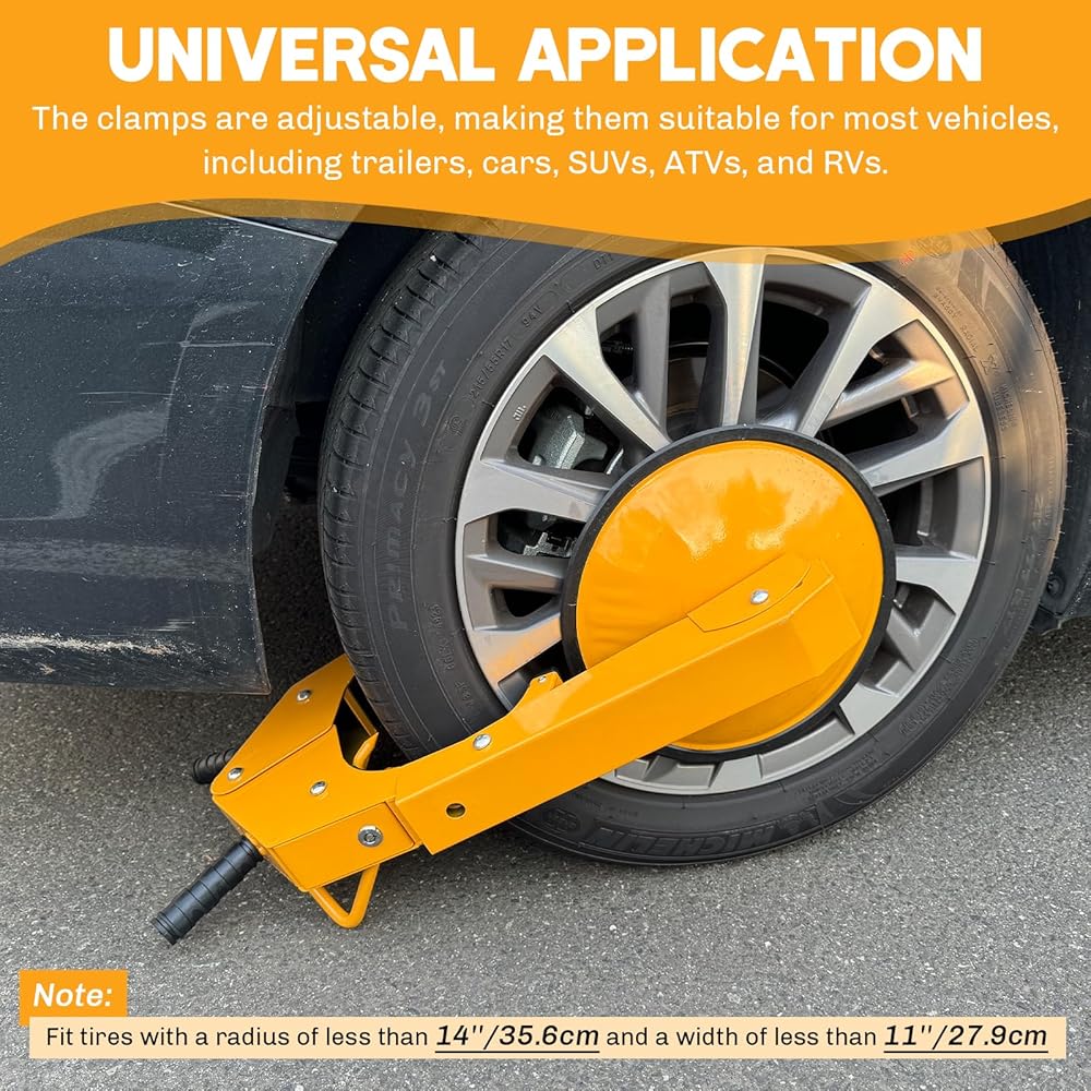 • 【يناسب معظم مقاسات الإطارات】تم تصميم مشبك قفل العجلة هذا ليناسب مجموعة واسعة من أحجام الإطارات، ويستوعب الإطارات بعرض قسم يصل إلى 11 بوصة ونصف قطر يصل إلى 14 بوصة. المشابك قابلة للتعديل، مما يجعلها مناسبة لمعظم المركبات، بما في ذلك المقطورات والسيارات وسيارات الدفع الرباعي والمركبات الرباعية والمركبات الترفيهية. يمنع المنتج بشكل فعال عجلات السيارة من الدوران أو الدوران، ويناسب الإطارات التي يبلغ نصف قطرها أقل من 14 بوصة وعرضها أقل من 11 بوصة.