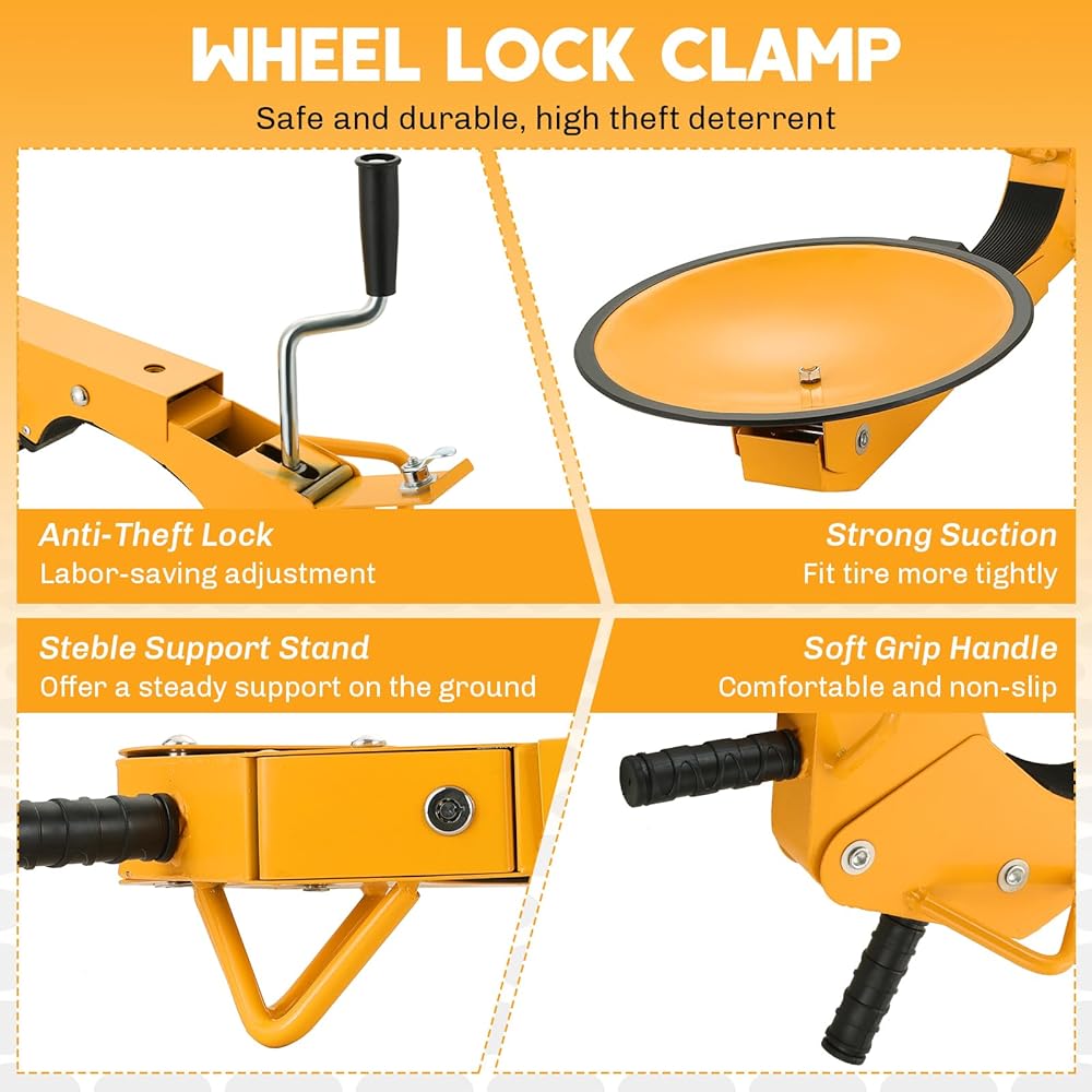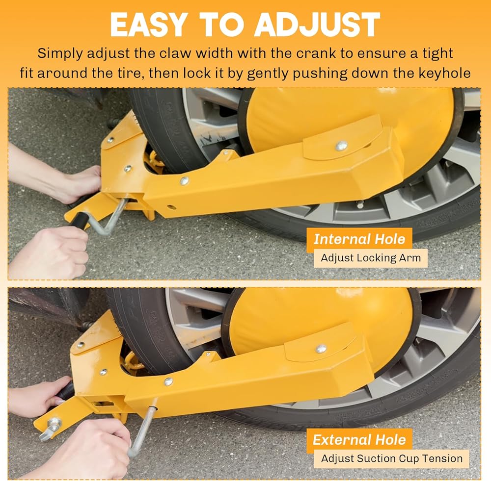 • 【تصميم سهل الاستخدام】يتميز قفل العجلة بتصميم صديق للإطارات مع حواف مستديرة وبطانة مطاطية لمنع خدوش الإطار ومحور العجلة. يضمن هذا التصميم أن المشبك يتوافق جيدًا مع الإطار دون التسبب في تلفه، مما يجعله خيارًا مثاليًا لحماية سيارتك مع الحفاظ على سلامة الإطارات والعجلات.