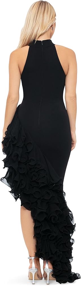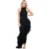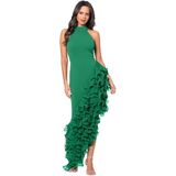 Turn heads at any event with this striking Sleeveless High Neck Ruffle Detail Asymmetrical Hem Dress. Designed with bold, cascading ruffles along one side, this dress brings a sense of drama and elegance. The high neckline and body-hugging fit offer a sleek and modern look, while the asymmetrical hemline adds a unique twist. Perfect for formal events or a night out, this dress combines elegance with an edge. A hidden back zipper ensures a secure, streamlined fit.