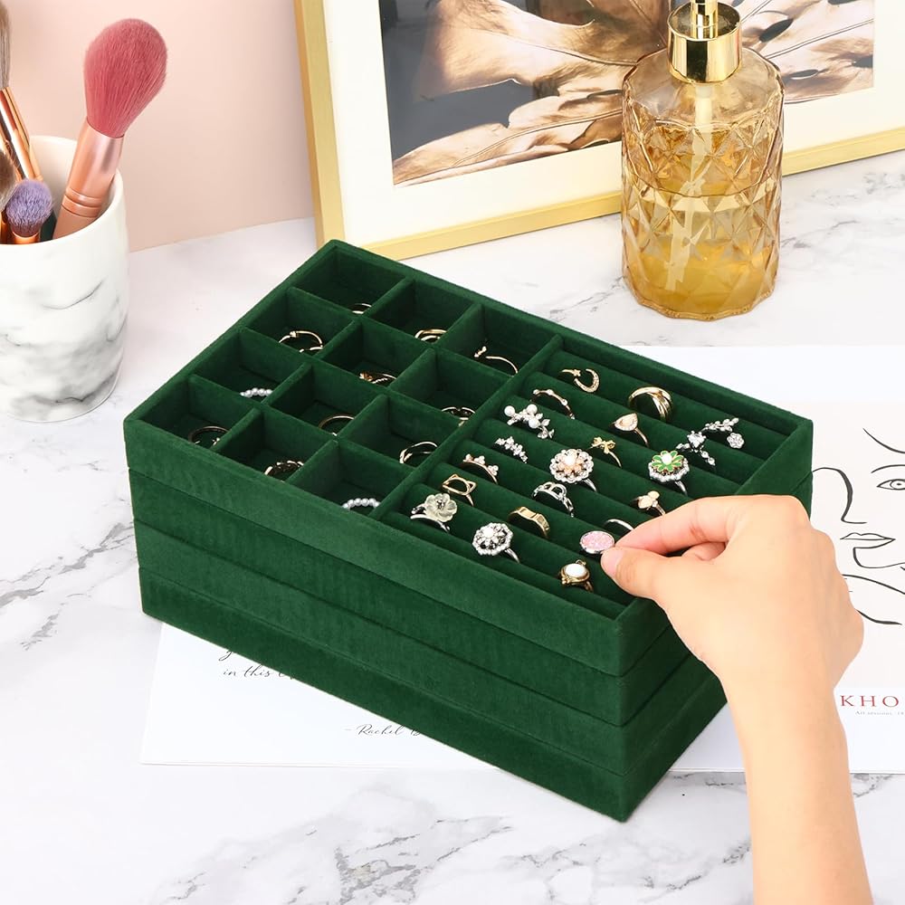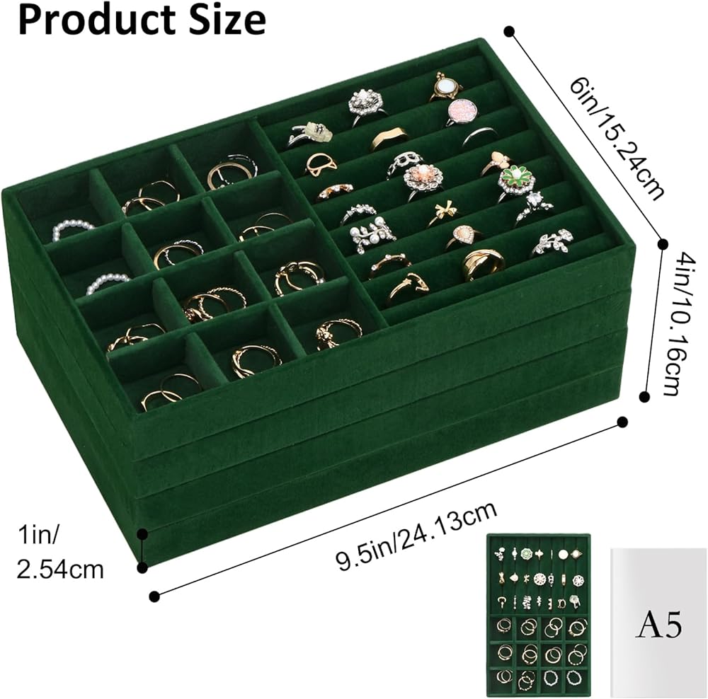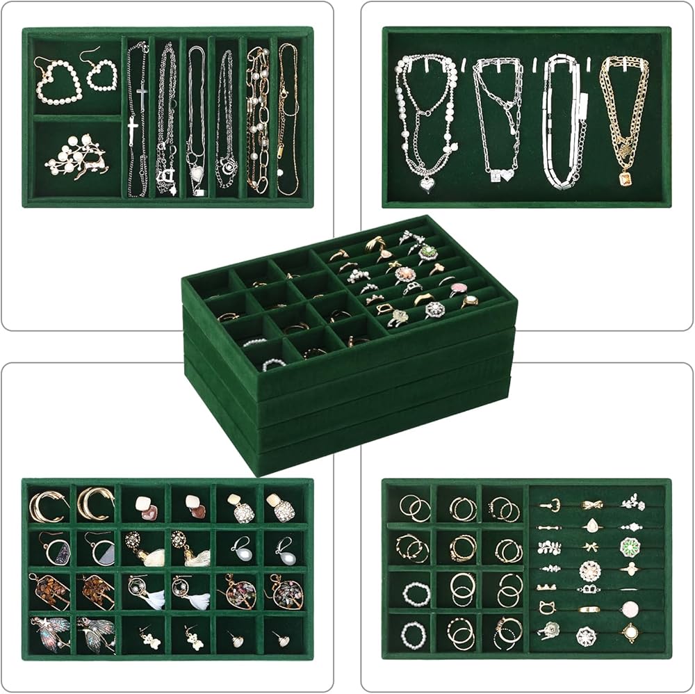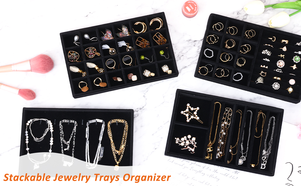 • حافظ على مجوهراتك منظمة ويمكن الوصول إليها بسهولة: مع مجموعتنا المكونة من 4 صواني مجوهرات قابلة للتكديس، لا مزيد من القلائد المتشابكة أو الأقراط المفقودة!