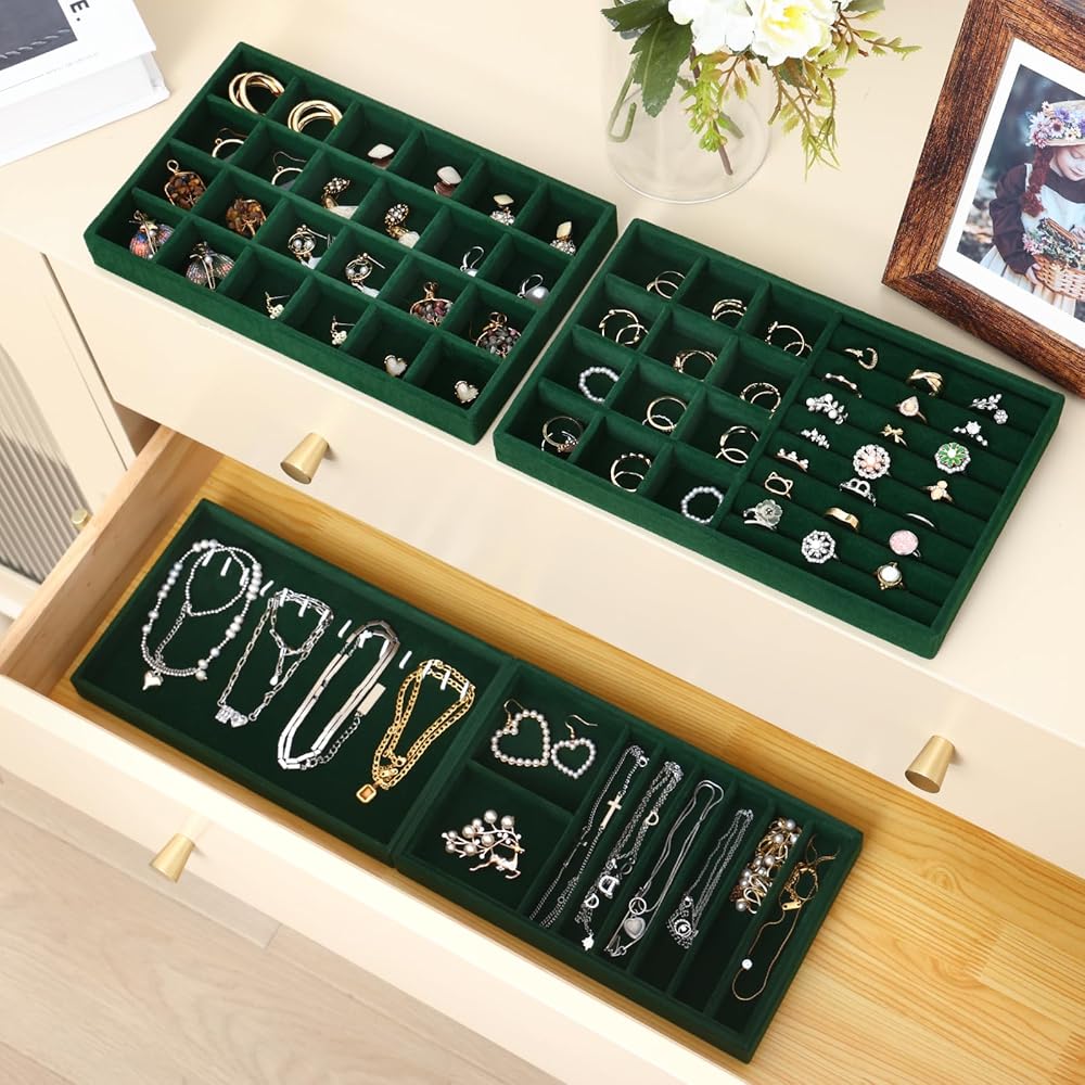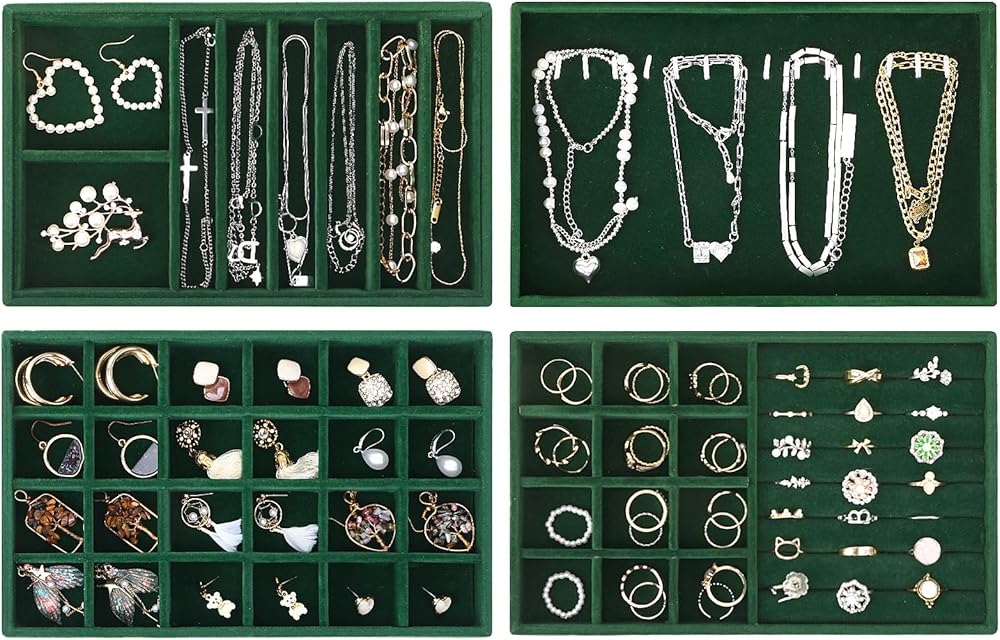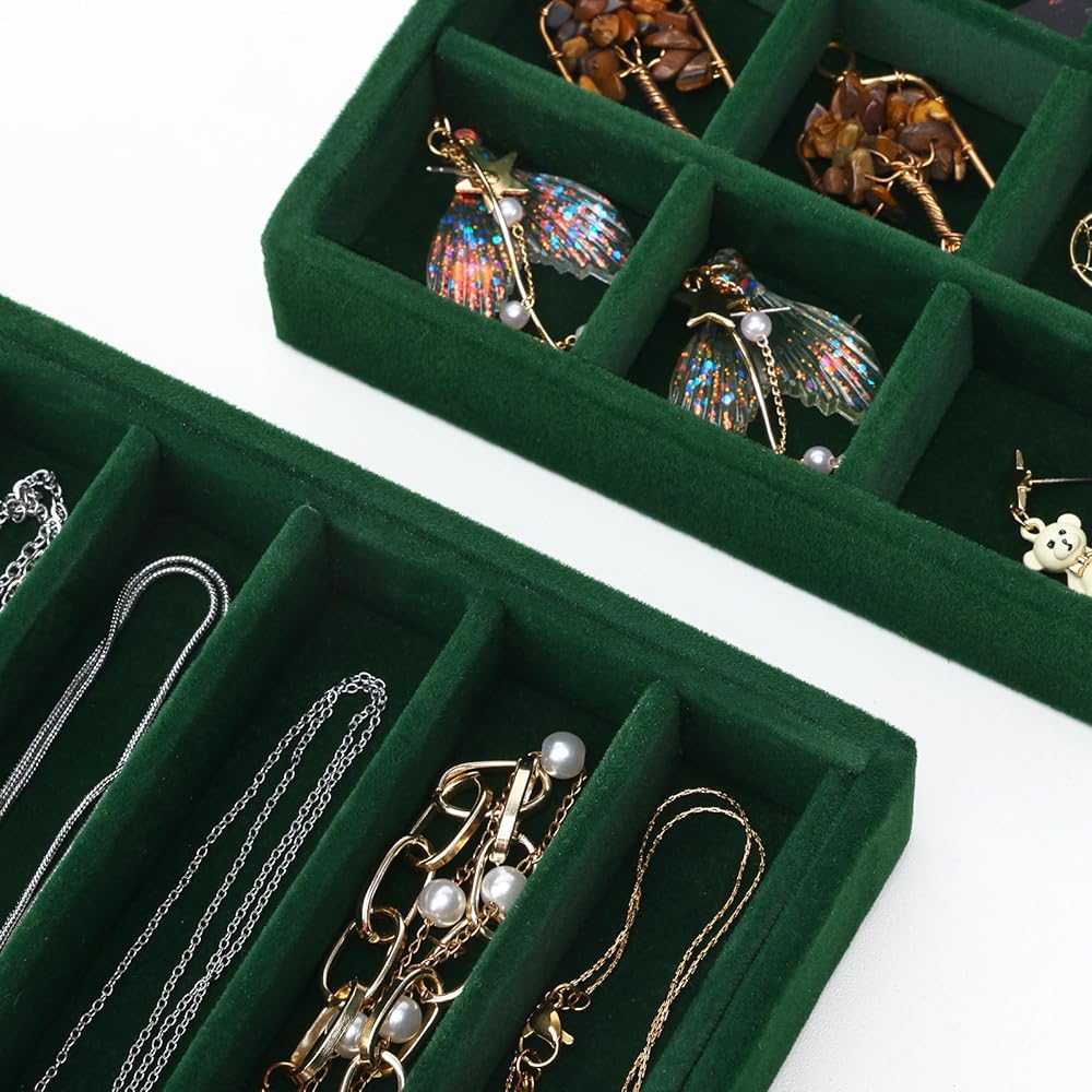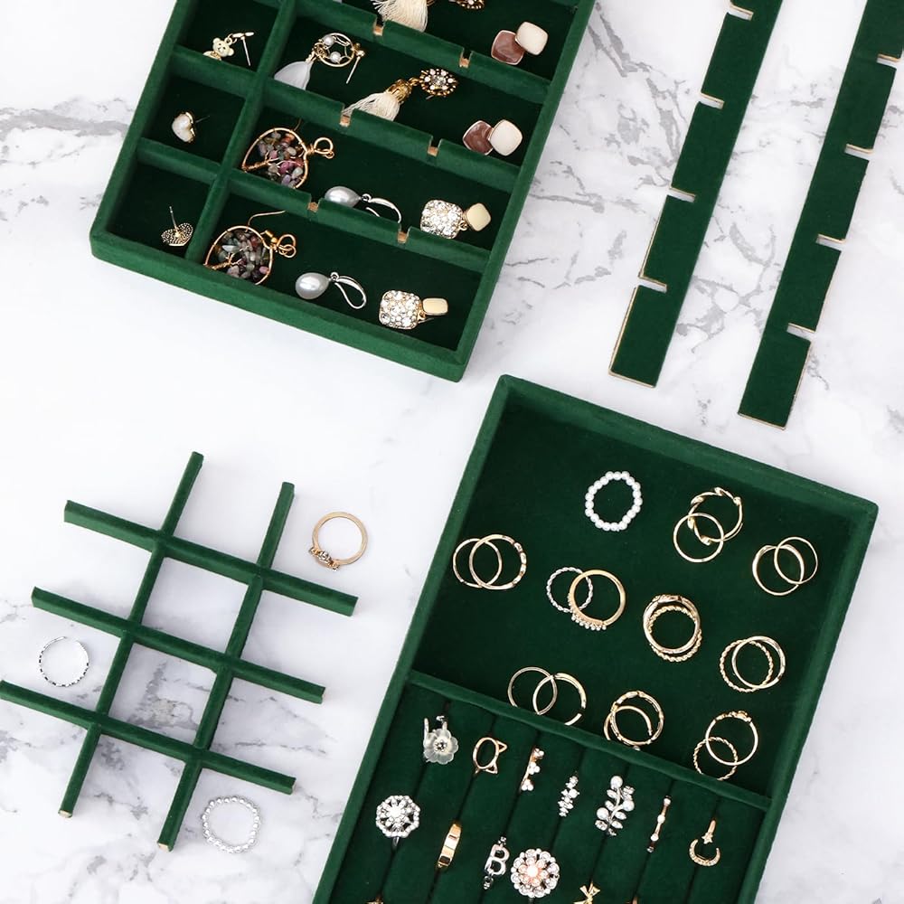 • حافظ على مجوهراتك منظمة ويمكن الوصول إليها بسهولة: مع مجموعتنا المكونة من 4 صواني مجوهرات قابلة للتكديس، لا مزيد من القلائد المتشابكة أو الأقراط المفقودة!