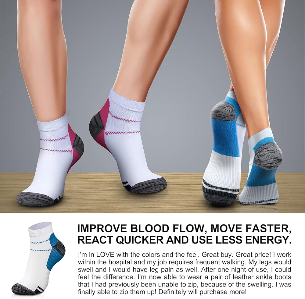 • جوارب ضغط - 6 أزواج في عبوة واحدة. أنت تحصل على عرض رائع للحفاظ على قدميك مع الضغط الأمثل طوال الوقت. جدول المقاسات: S/M (الرجال 5-9؛ النساء: 5.5-8.5)، L/XL (الرجال 8-14؛ النساء 8-15.5)