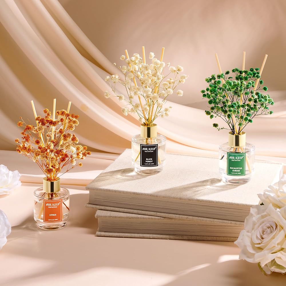 تشتمل على: 3 × زجاجة زجاجية لتوزيع العطور مع عطر زيوت عطرية بسعة 1.69 أونصة سائلة (50 مل)، و3 مجموعات من الزهور المحفوظة، و24 × أعواد توزيع روائح القصب، و1 × صندوق هدايا رائع.