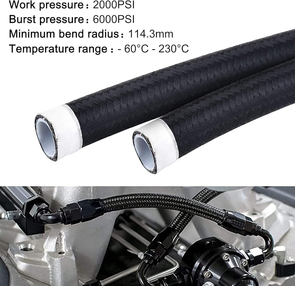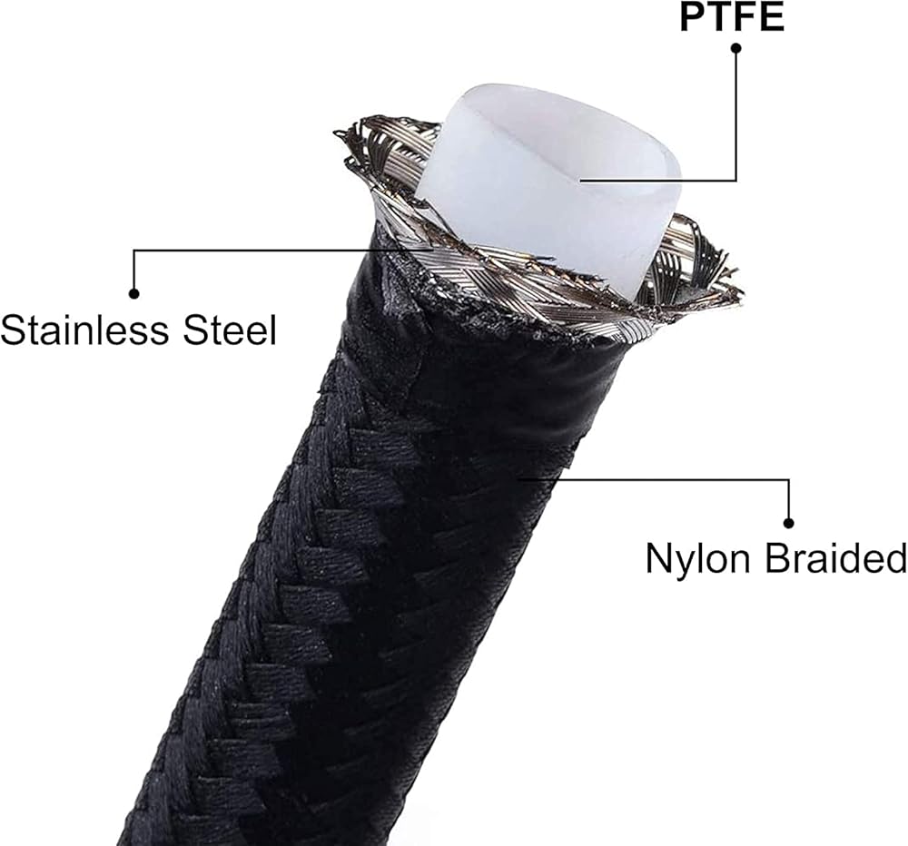 مواد فاخرة: توفر خطوط الوقود PTFE مقاومة واسعة للوقود، بما في ذلك E85. يضمن الاحتكاك المنخفض والحاجز العالي لـ PTFE تدفقًا سلسًا للوقود. تضمن جديلة النايلون وشبكة الفولاذ المقاوم للصدأ 304 المتانة والقوة مع الحفاظ على المظهر الرائع