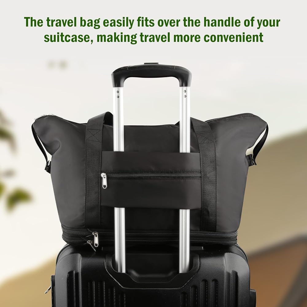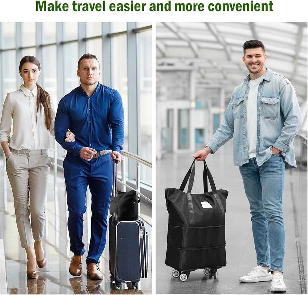 【قابلة للحمل】حقيبة السفر مجهزة بعجلات دوارة 360 درجة، مما يجعل من السهل نقل متعلقاتك أثناء السفر. ليست هناك حاجة لإمالة أو رفع حقيبة السفر، وبالتالي تقليل الضغط على ذراعيك وأكتافك عند حمل متعلقاتك. يمكن وضع حقيبة السفر بسهولة على مقبض حقيبتك، مما يجعل السفر أكثر راحة.
