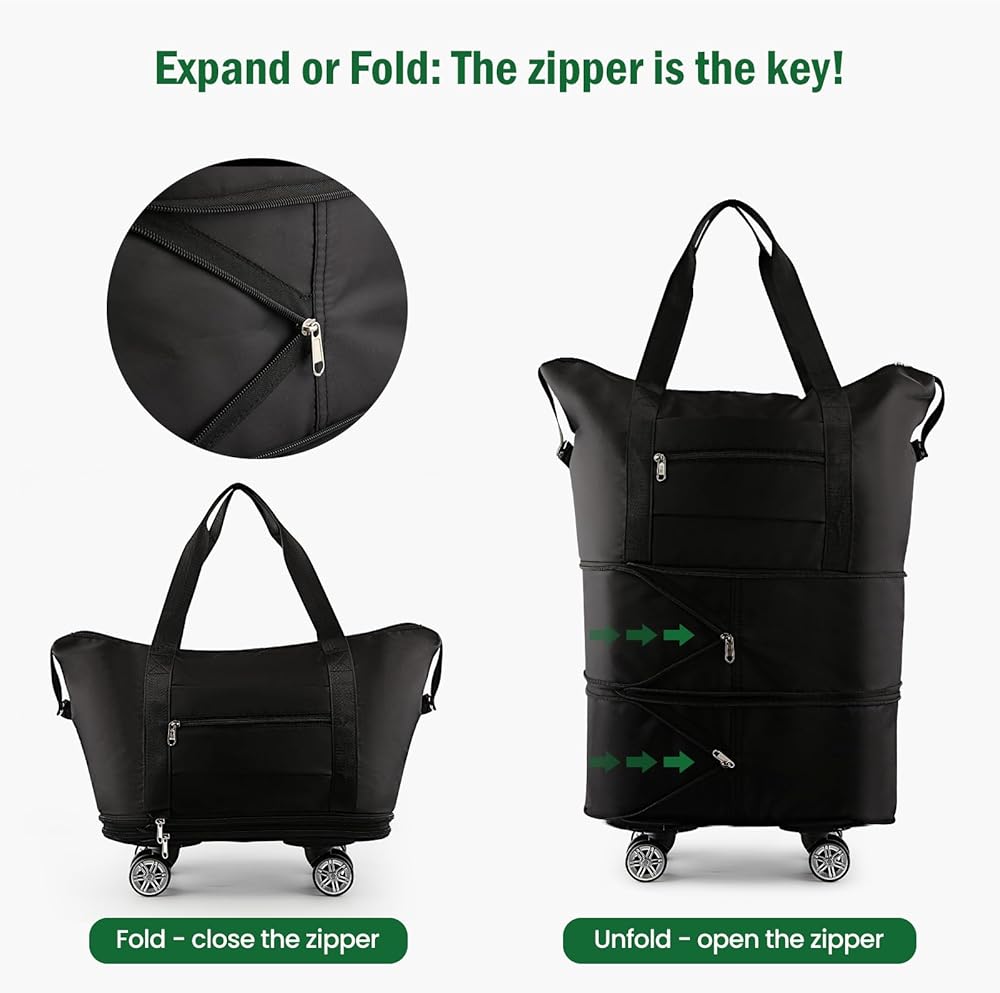 【قوية ومتينة】حقيبة السفر هذه ذات العجلات مصنوعة من قماش أكسفورد المقاوم للاهتراء والخدش، مع بطانة من البوليستر. يتمتع نسيج حقيبة السفر بدرجة معينة من مقاومة الماء. وهي مجهزة بمقبض مقوى لسهولة الحمل والسحب، بالإضافة إلى سحاب معدني متين.