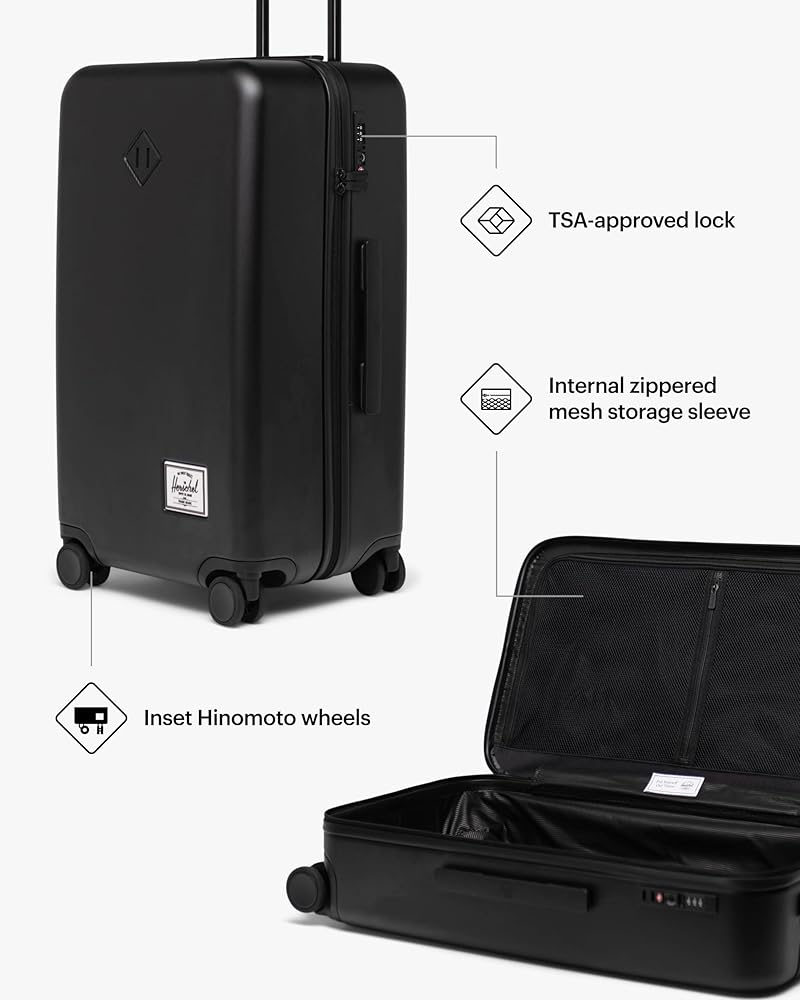 Made and tested for real travel. Built with 70% recycled polycarbonate, the Herschel Heritage™ Hardshell Large Luggage is impact-resistant and tough enough to handle all the journeys you're taking. Pack easily with a split design and storage features and roll silently on inset Hinomoto wheels.