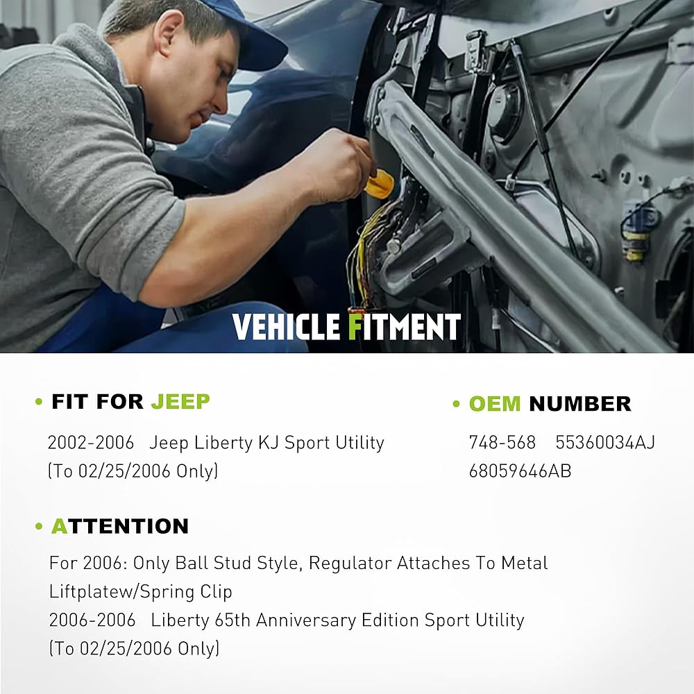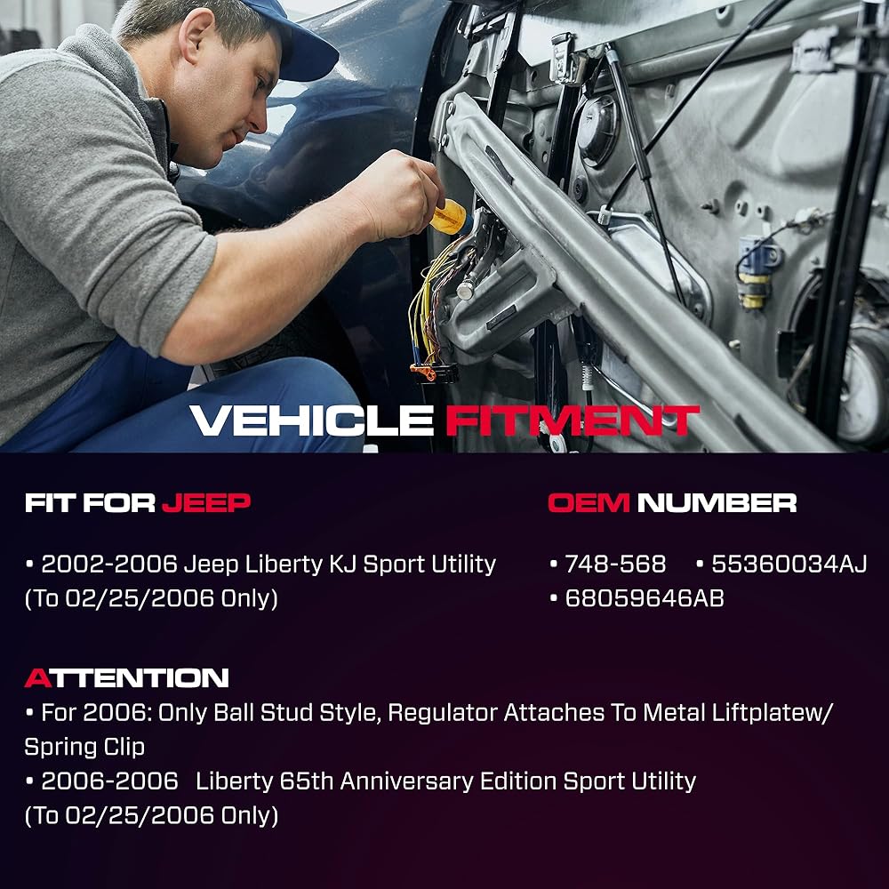 • نماذج المركبات: منظم النافذة الأمامي يناسب جانب السائق لسيارة Jeep Liberty 65th لعام 2006، Sport Utility (نمط مسمار الكرة)، يناسب فقط السيارة التي تم تصنيعها قبل 02/25/2006