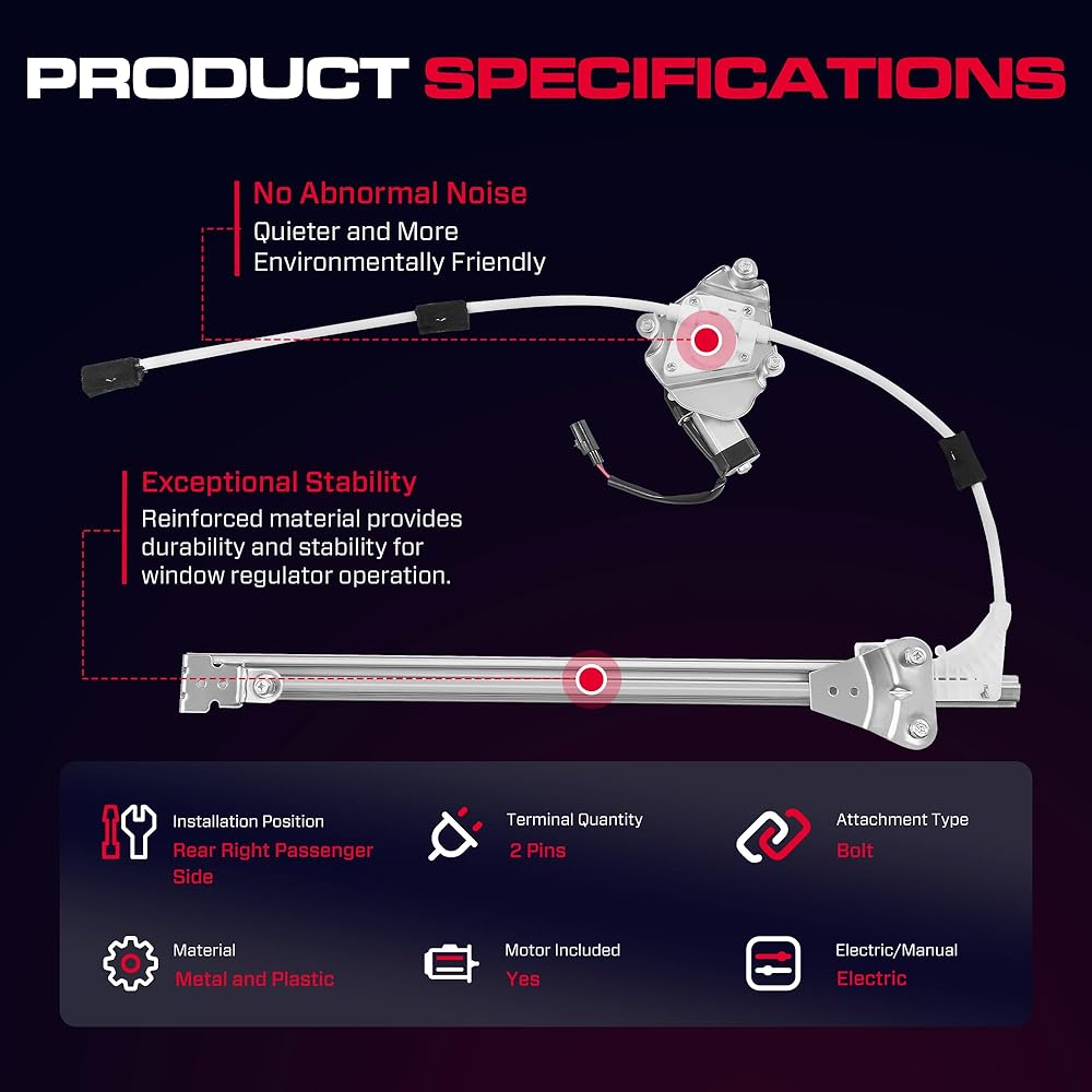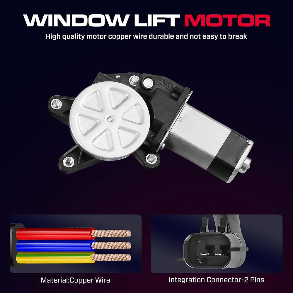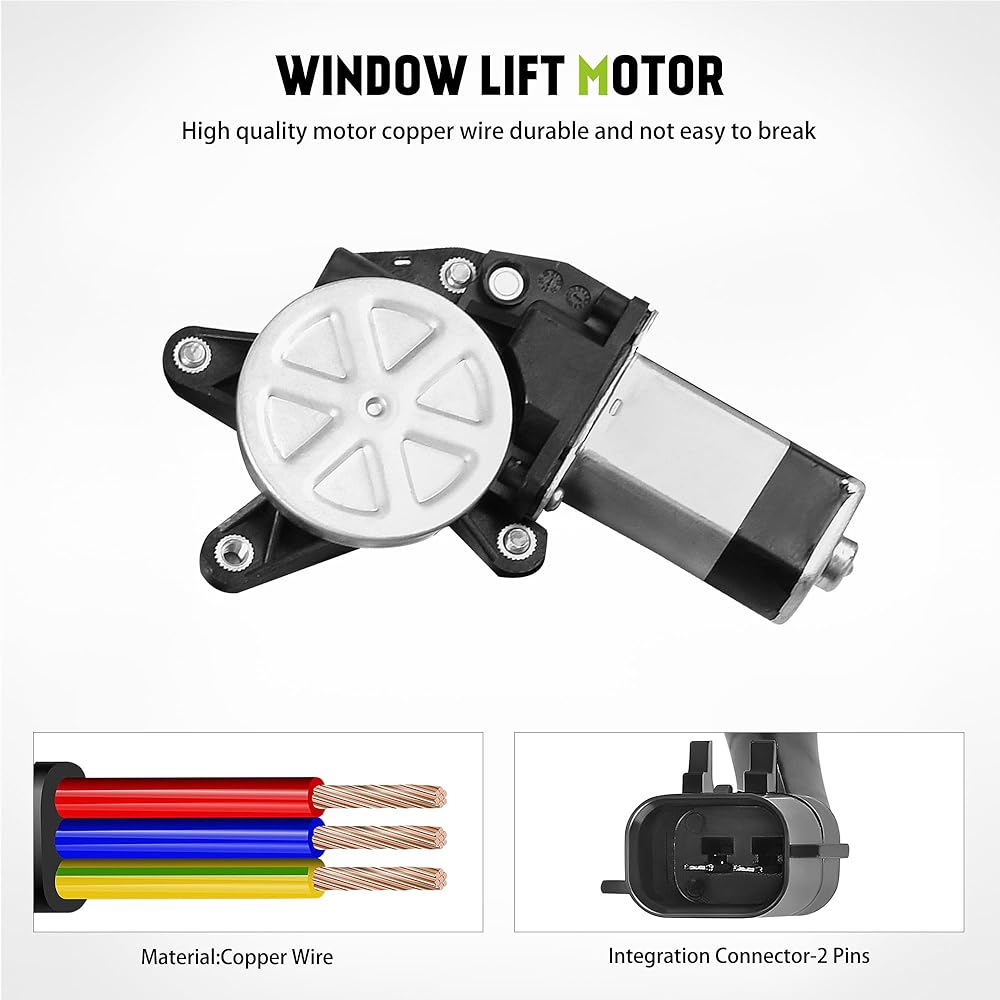 • رقم OEM: منظم نوافذ الطاقة من جانب السائق ومجموعة المحرك مناسب لـ 741-526، 55360031AM، 55360031AB، 55360031AG، 55360031AH، 55360031AJ، 68059644AA. فقط للسيارات القادمة مع محرك 2 Pins