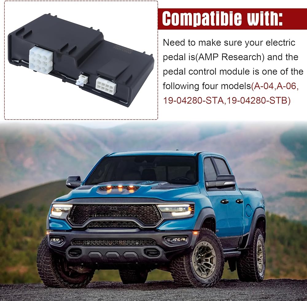 نماذج متوافقة - تحتاج إلى التأكد من أن الدواسة الكهربائية الخاصة بك هي (AMP Research) وأن وحدة التحكم في الدواسة هي واحدة من النماذج الأربعة التالية (A-04، A-06،19-04280-STA،19-04280-STB)، لا لسيارة Super Duty 2002 2003 2008-2012 غير مناسبة لـ F150 2009-2012، غير متوافقة مع Jeep Wrangler JK 2007-2017؛ جيب جراند شيروكي 2014-2017.يرجى التحقق بعناية قبل الشراء لتجنب التأثير على تجربتك