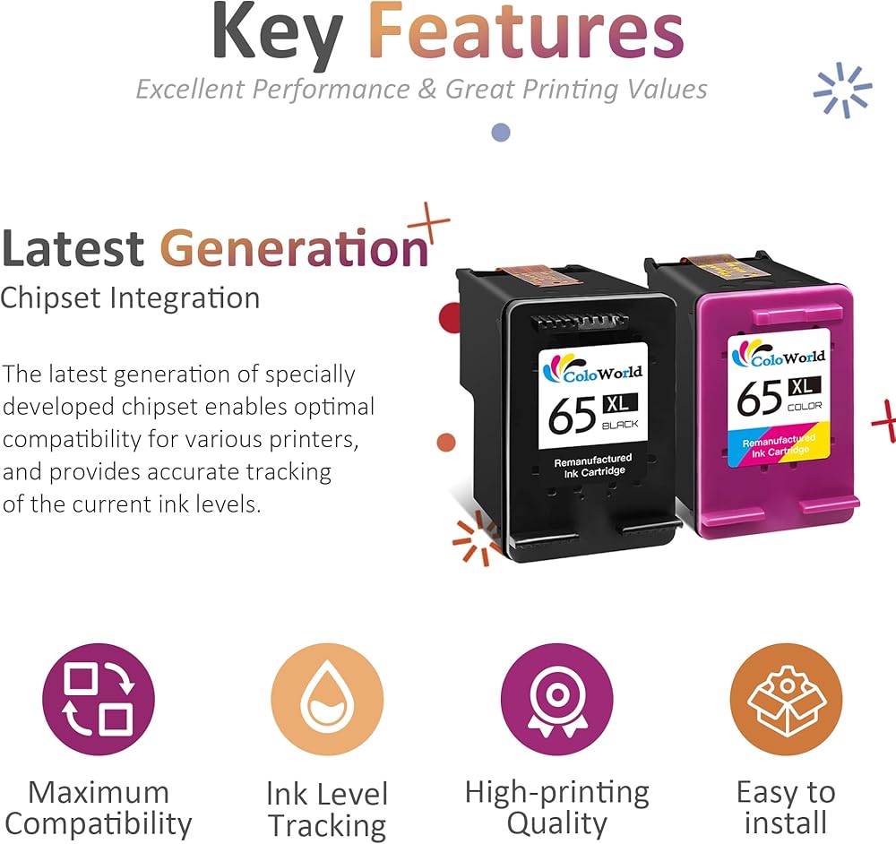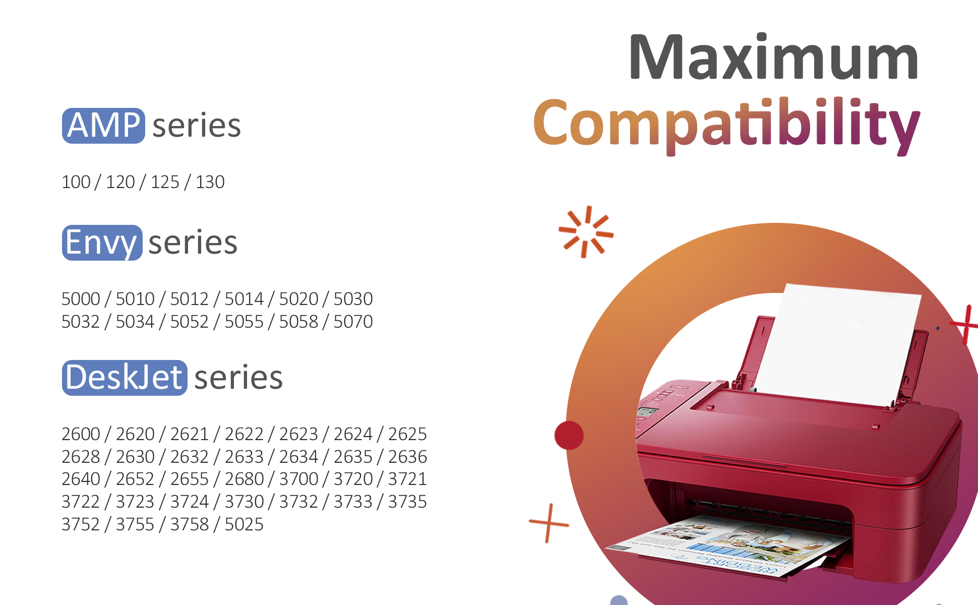 Package includes: 2 Pack of Remanufactured Ink Cartridges for HP 65 65XL (1 Black, 1 Tri-Color ) , 1 User Guide. Page Yield: 750 Pages per Black 65XL ink cartridge, 450 Pages per Color 65XL Ink Cartridge (depends on printer and usage). Compatible for HP Printers: HP Deskjet 2620 HP Deskjet 2621 HP Deskjet 2622 HP Deskjet 2623 HP Deskjet 2624 HP Deskjet 2625 HP Deskjet 2628 HP Deskjet 2630 HP Deskjet 2632 HP Deskjet 2633 HP Deskjet 2634 HP Deskjet 2652 HP Deskjet 2655 HP Deskjet 3720 HP Deskjet 3721 HP Deskjet 3722 HP Deskjet 3723 HP Deskjet 3724 HP Deskjet 3730 HP Deskjet 3732 HP Deskjet 3733 HP Deskjet 3735 HP Deskjet 3752 HP Deskjet 3755 HP Deskjet 3758 HP Envy 5010 HP Envy 5020 HP Envy 5030 HP Envy 5032 HP Envy 5034 HP Envy 5052 HP Envy 5055 HP Envy 5058 HP AMP 100 HP AMP 120 HP AMP 125 HP AMP 130