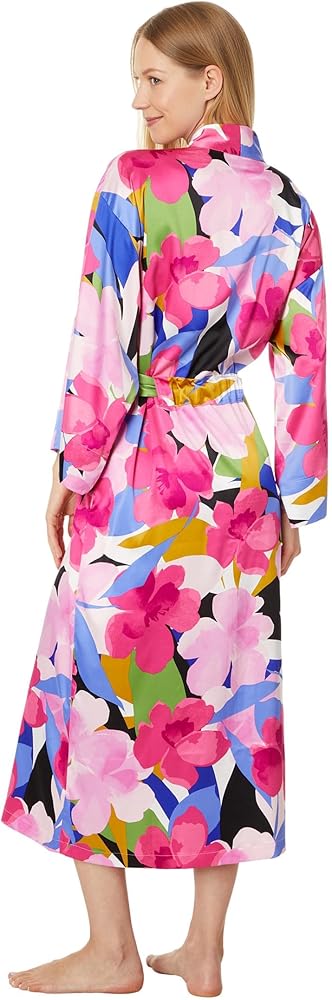 Feel bonita in watercolor florals printed on matte satin. Full length robe. Self tie. Luxurious with a sleek finish. Extra comfort due to elasticity of spandex. A classic robe in our silky smooth satin fabric.