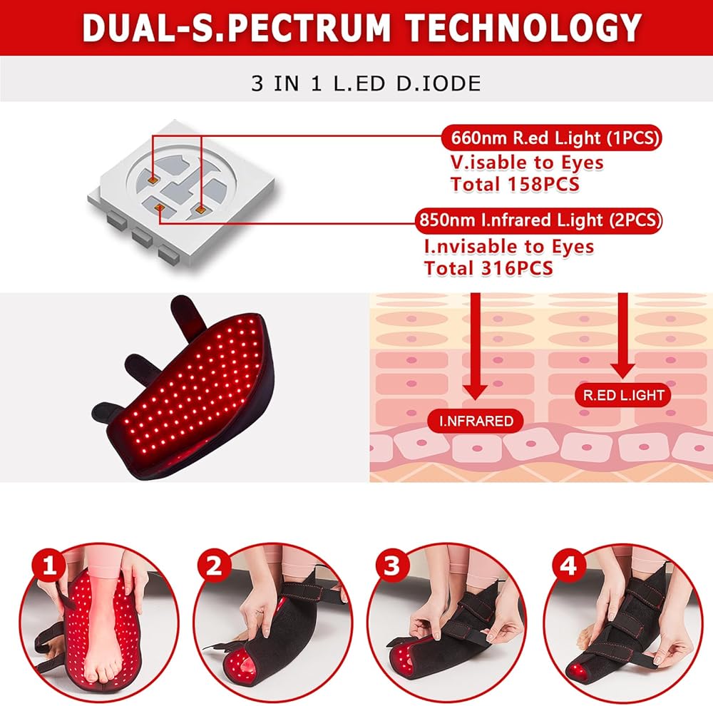 رقاقة فريدة من نوعها: يستخدم ضوء r.ed للأقدام شريحة 3 في 1، مع 158 قطعة 660 نانومتر r.ed l.ight (ضوء مرئي) و316 قطعة 850 نانومتر ضوء الأشعة تحت الحمراء (ضوء غير مرئي) )