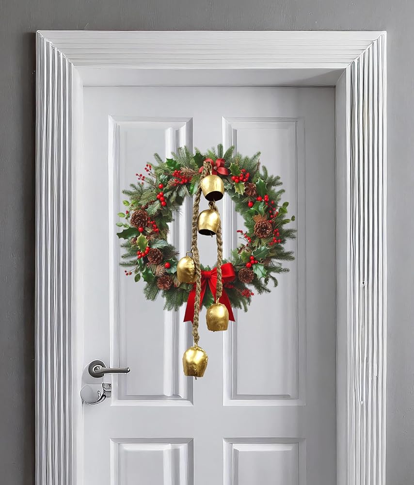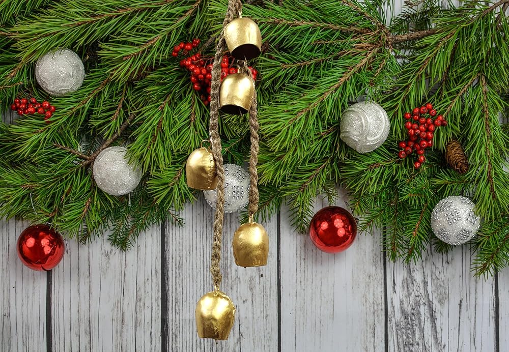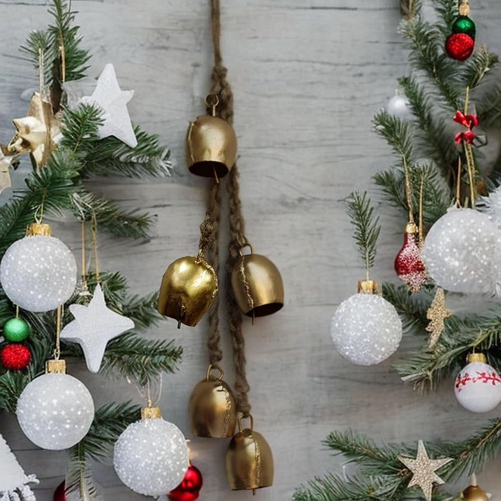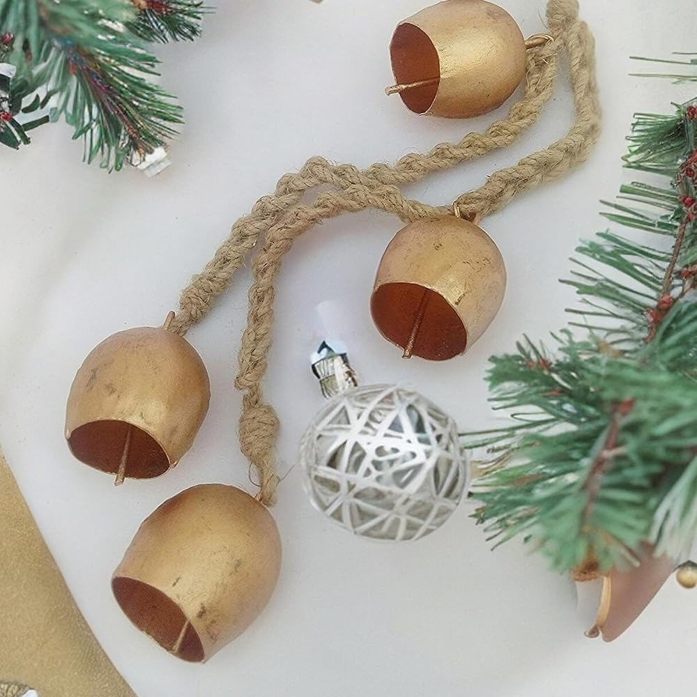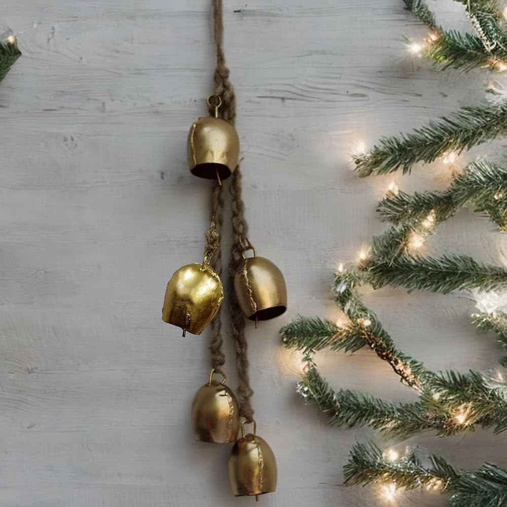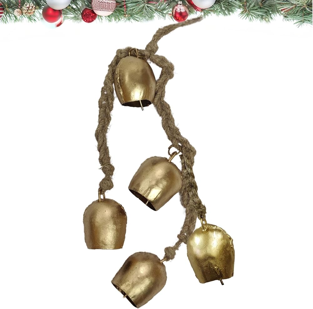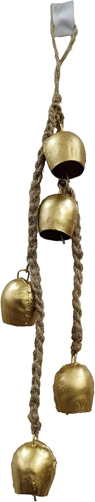 Bring a touch of rustic charm to your home with this handcrafted iron wrought bell chime. Featuring four brass-finished bells strung together on a sturdy rope, this decorative piece is perfect for hanging on your wall or porch. The warm metallic tones and shabby chic design create a cozy, inviting ambiance. Ideal for celebrating holidays like Christmas and Easter, or simply adding a whimsical accent to your living space. Crafted with care, this bell chime is a delightful addition to any room. Measurements: Rope length approximately 1.8 ft, bells approximately 1.5x1 in size.