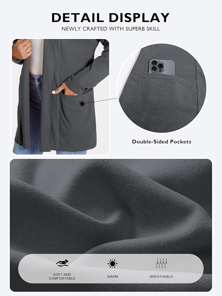 السمات: سترة نسائية، لون موحد، جيبان أماميان جانبيان، مقاس فضفاض، نسيج ناعم ومطاط، أكمام طويلة، وتأتي بطول منفضة. هذه السترات المفتوحة المريحة تمنح مظهرك مظهرًا سلسًا وسهلًا وتخلق أيضًا مظهرًا رأسيًا قويًا خط حتى تبدو أطول وأنحف