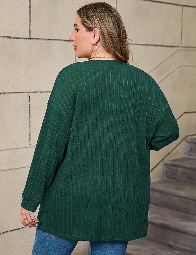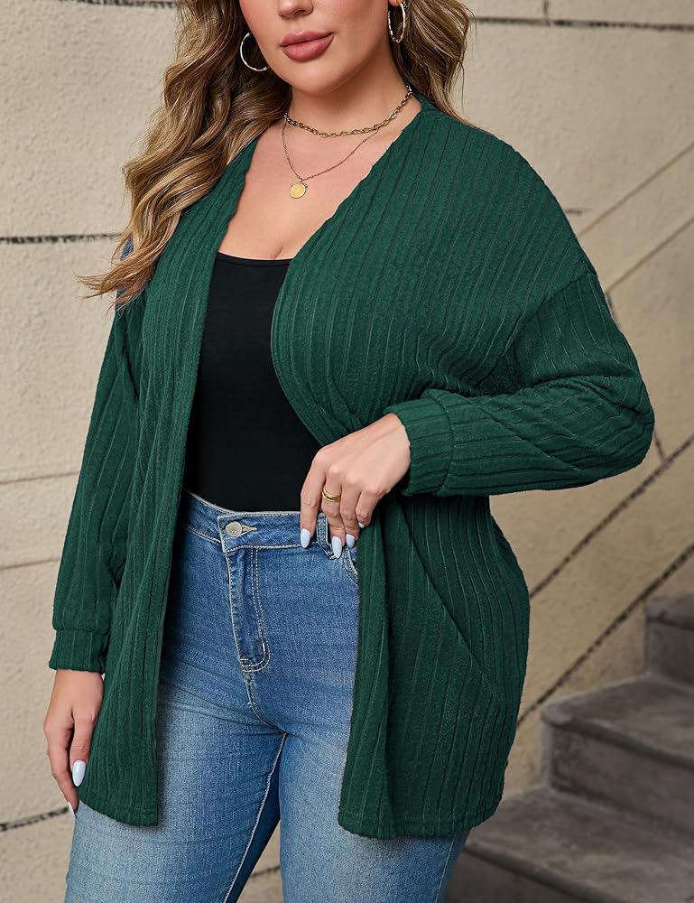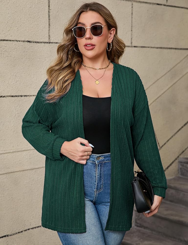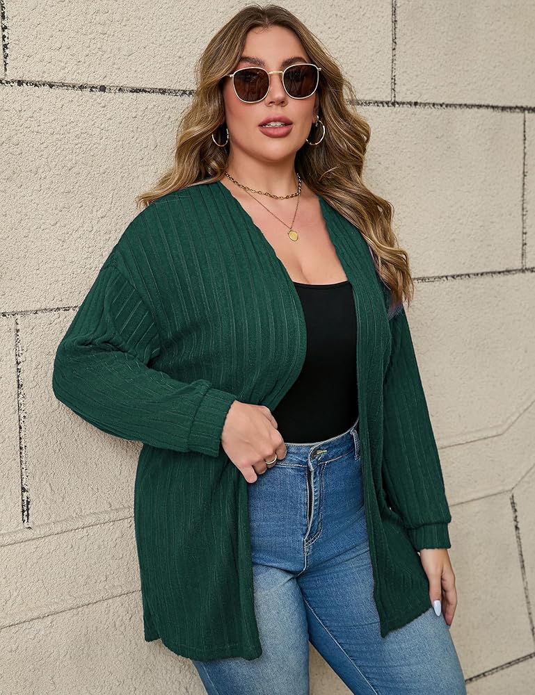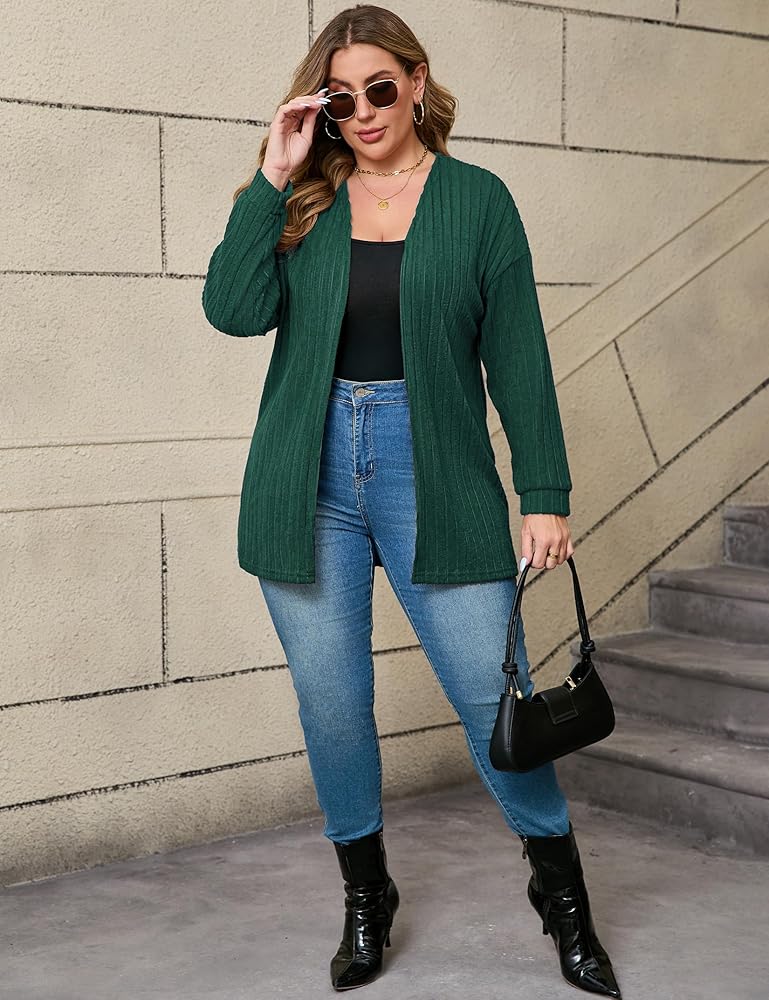 • سترة صوفية نسائية مقاس كبير من Shopwonder سترة صوفية مضلعة مفتوحة من الأمام وأكمام طويلة مريحة وقابلة للتمدد سترة صوفية للخريف